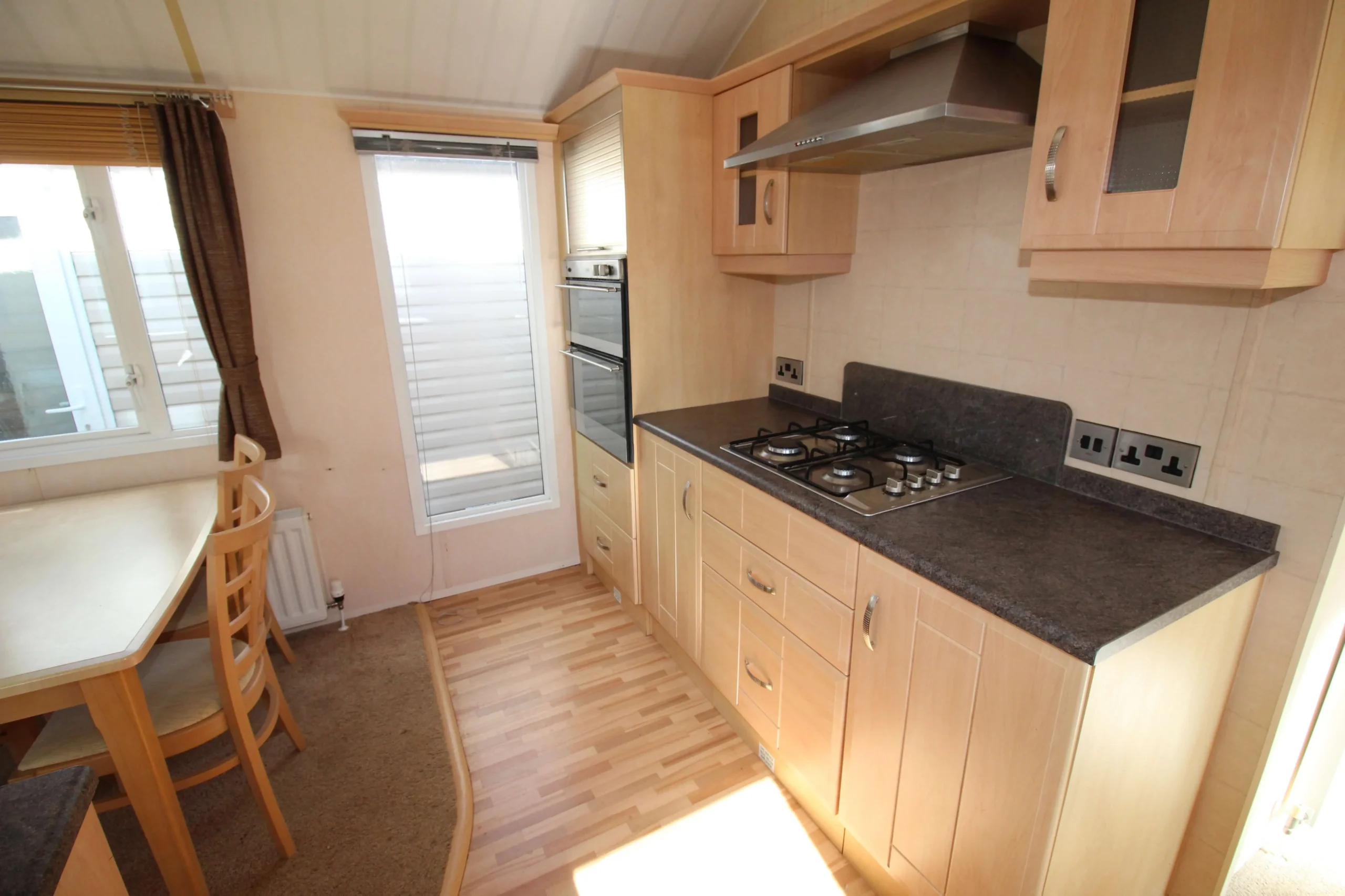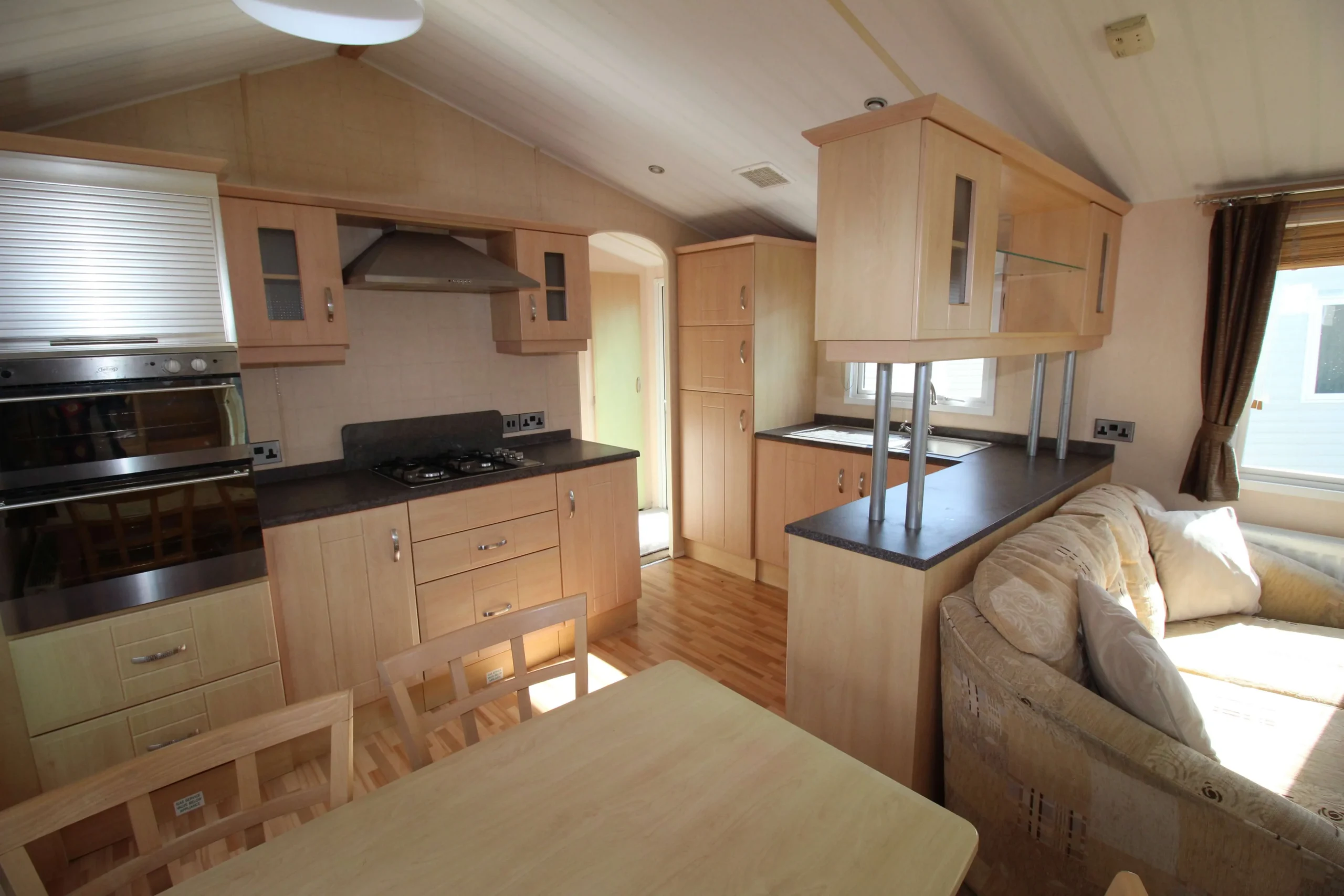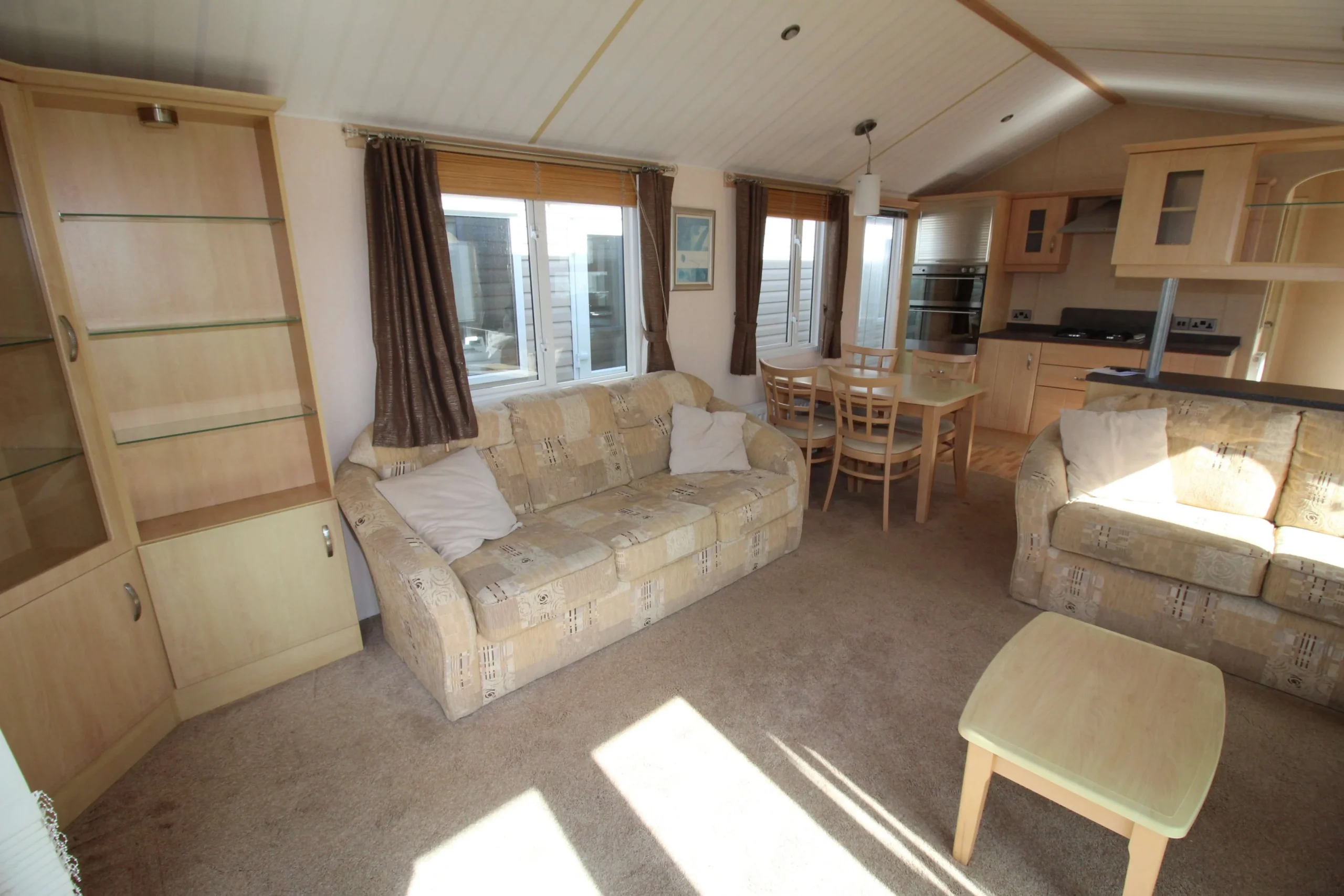 The kitchen includes an integrated fridge freezer and ample cupboard space. Therefore, it offers both practicality and convenience for everyday use. The freestanding dining table with four chairs provides a perfect space for meals, games, or relaxing with family.