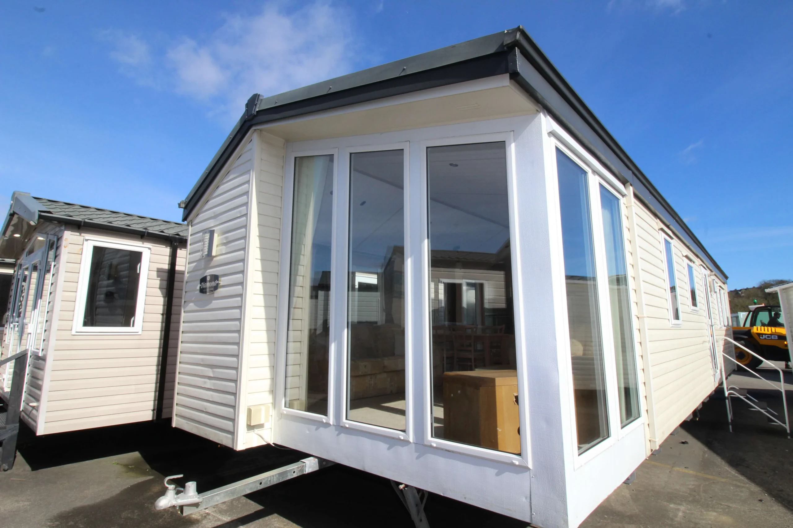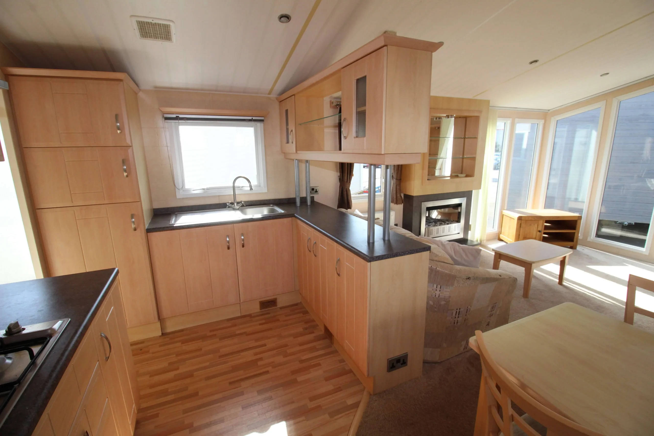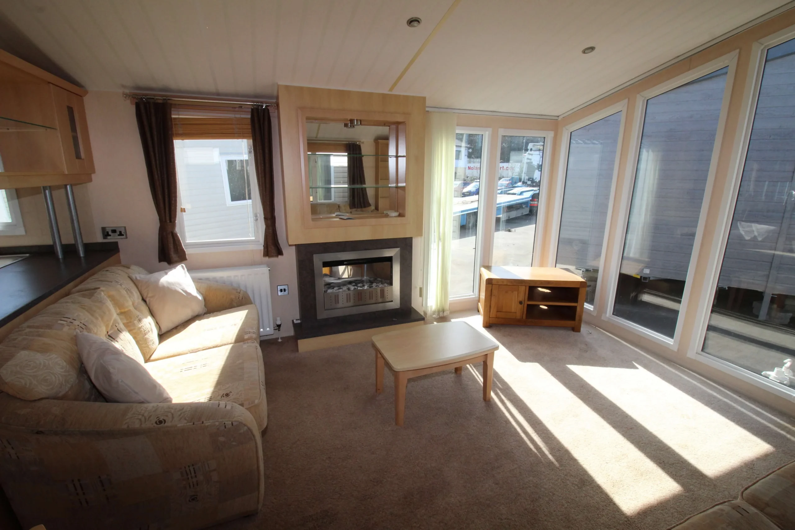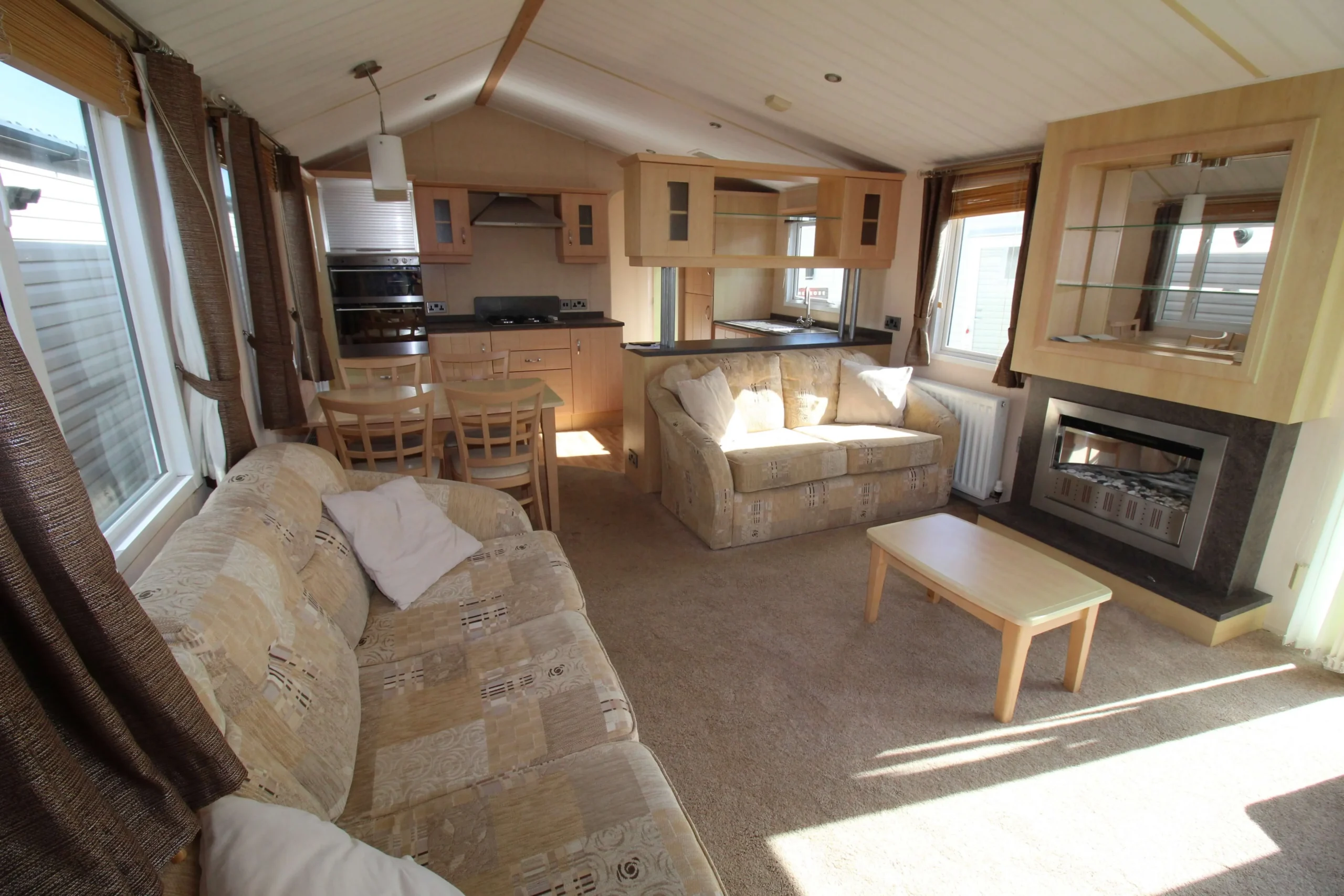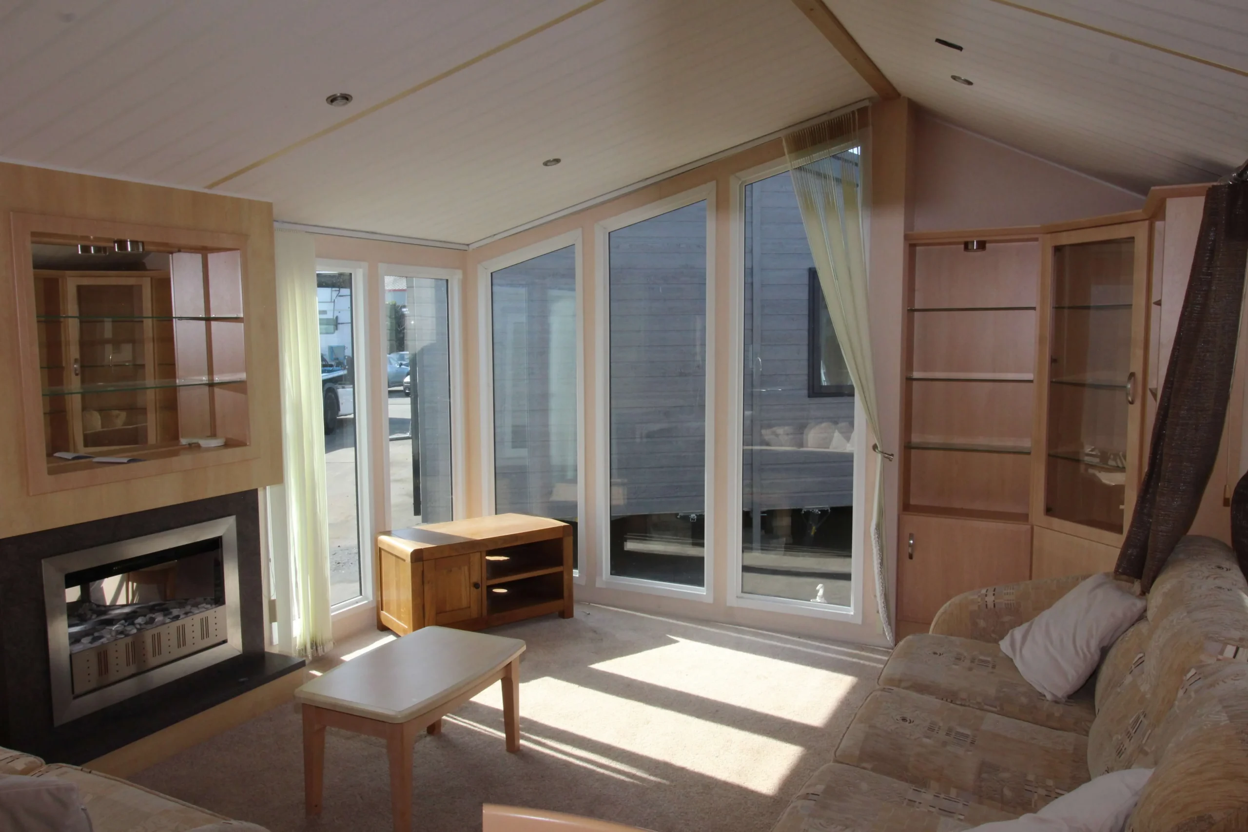 The front of the mobile immediately stands out. Floor-to-ceiling windows flood the lounge with natural light all day. As a result, the living space feels open, airy, and welcoming from the moment you step inside.