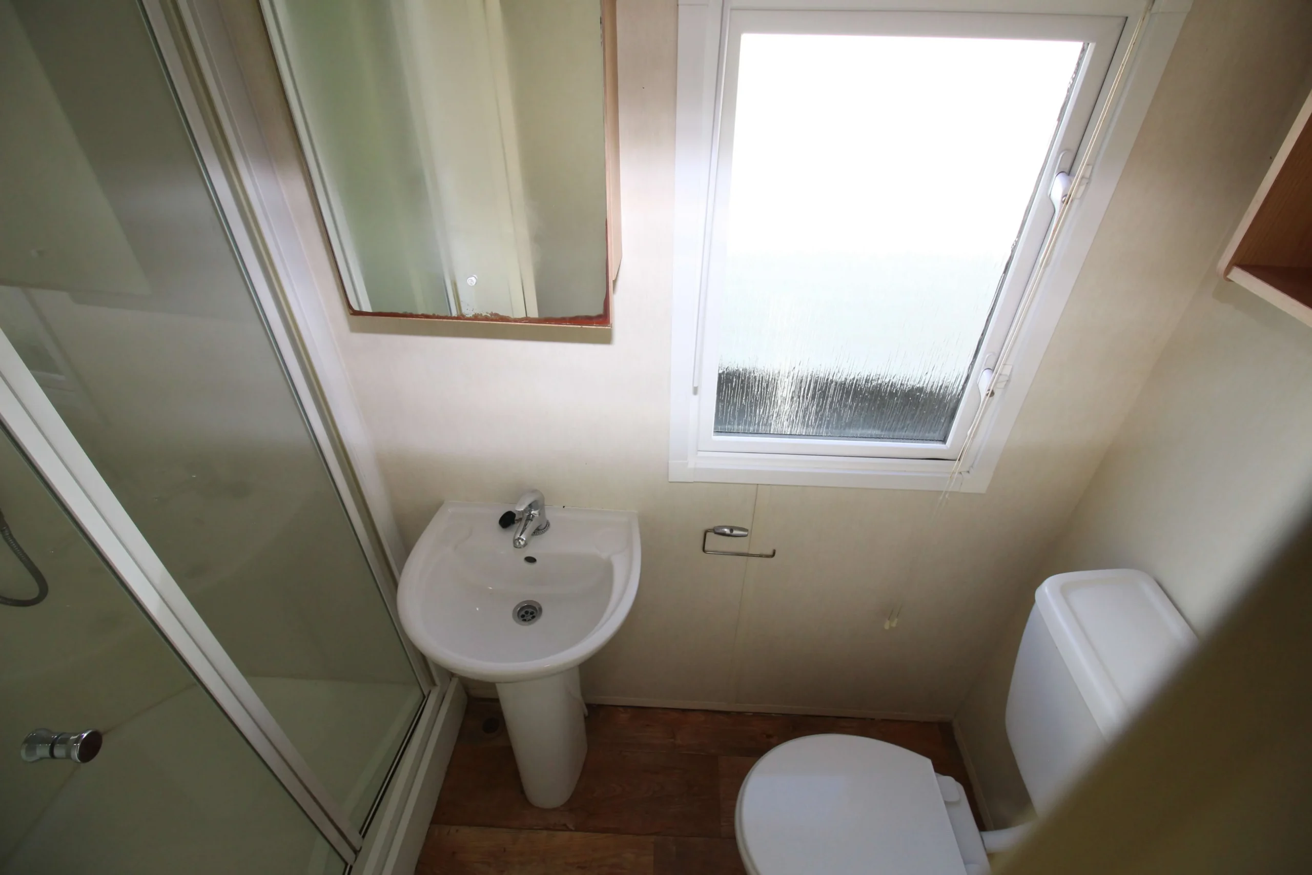 The mobile also includes two bathroom areas, which adds valuable convenience. The main bathroom features a shower, wash hand basin, and toilet. In addition, a second bathroom in the hallway includes a toilet and wash hand basin. Therefore, multiple occupants can use the facilities without waiting.
