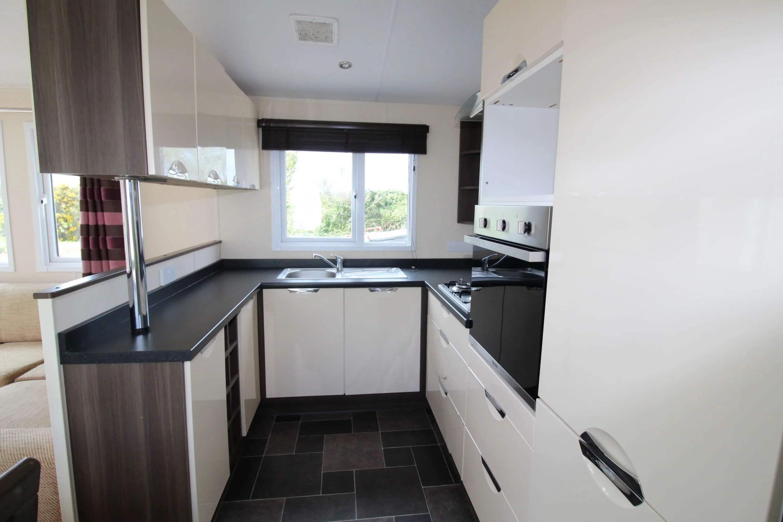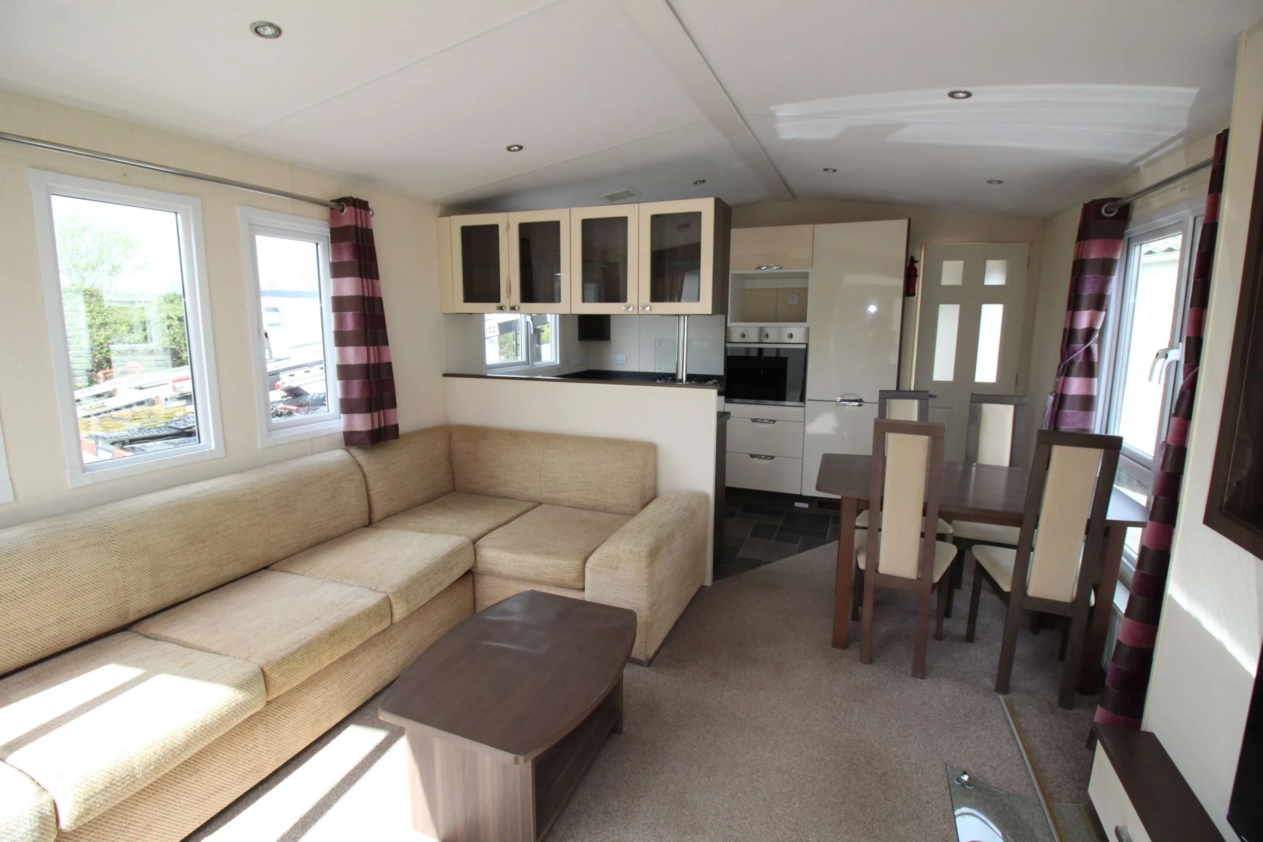 The lounge feels spacious and relaxing. A large L-shaped couch provides plenty of seating, and it also includes a pull-out sofa bed for extra guests. Therefore, this mobile home works perfectly for both everyday living and hosting.