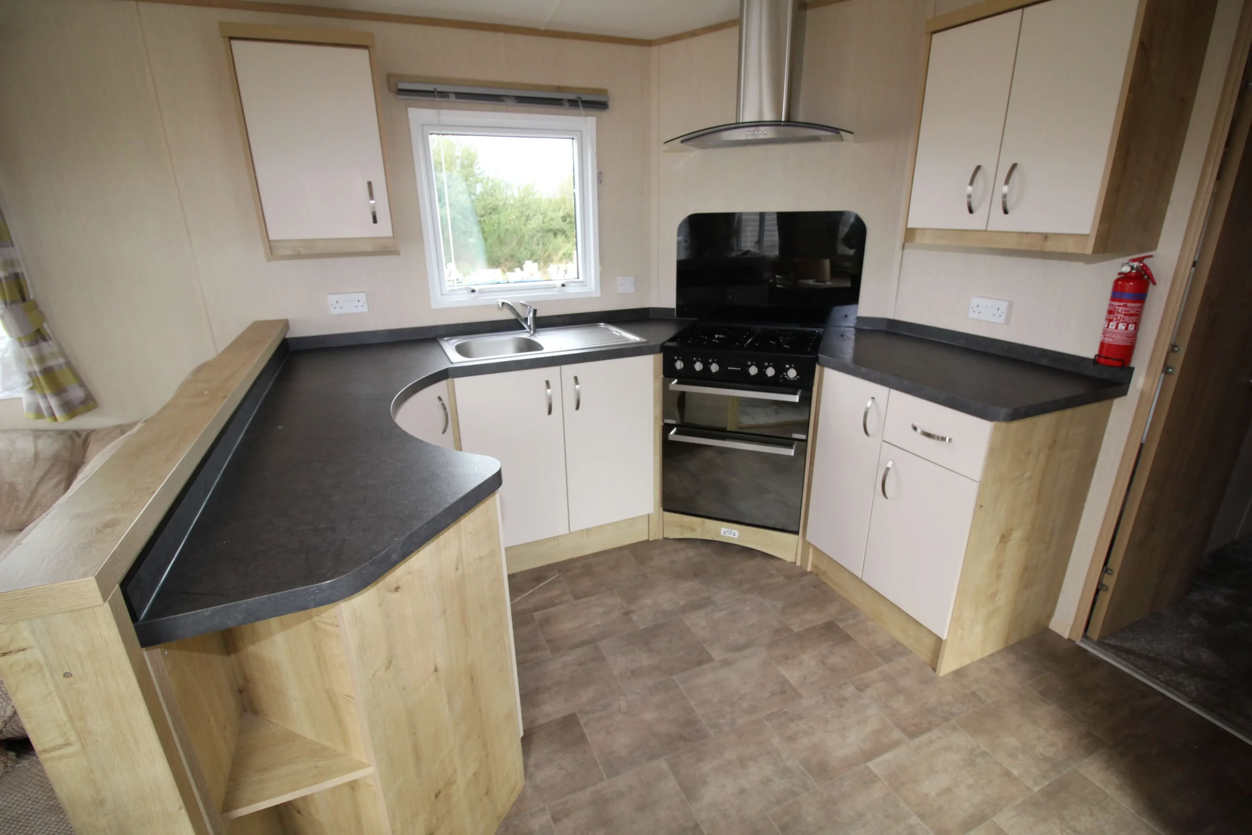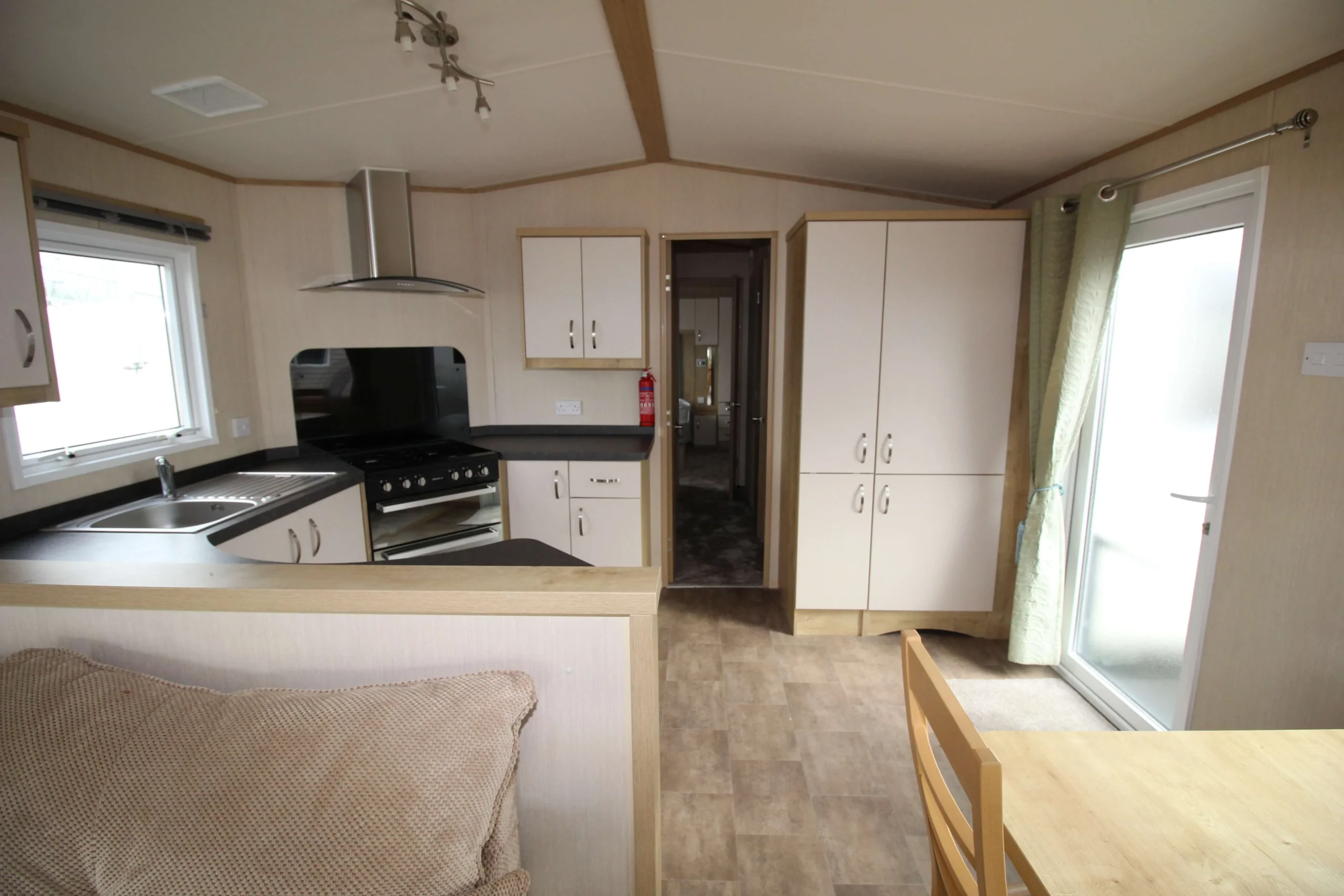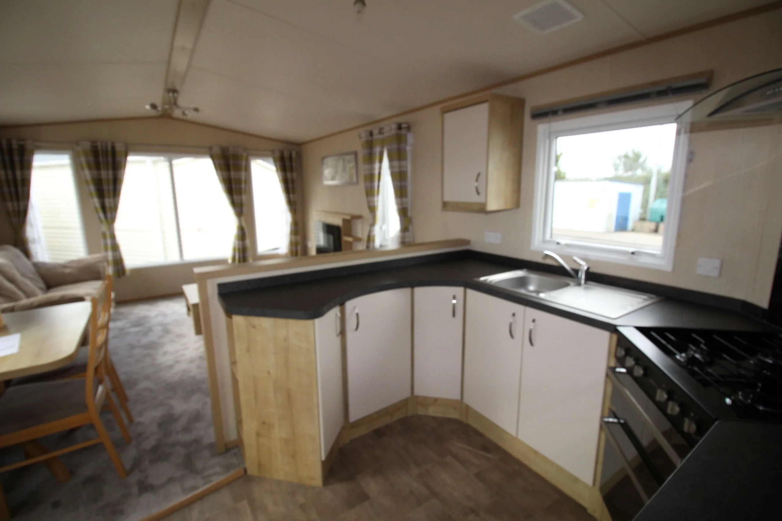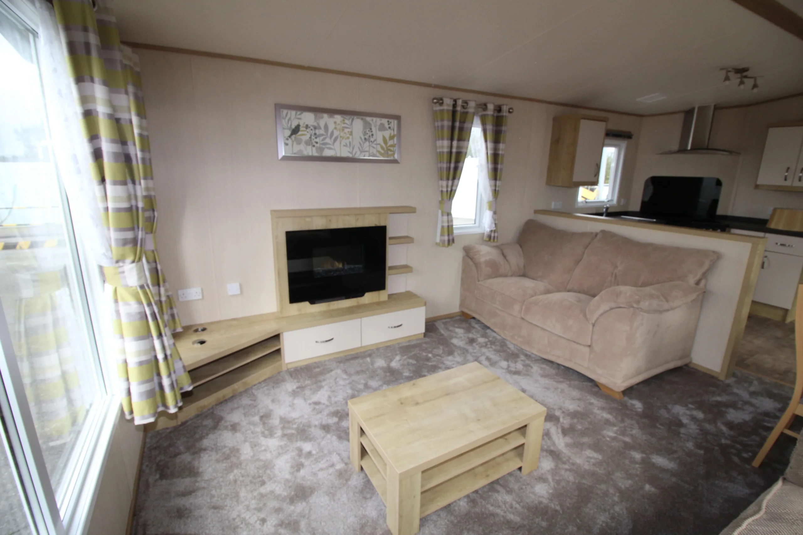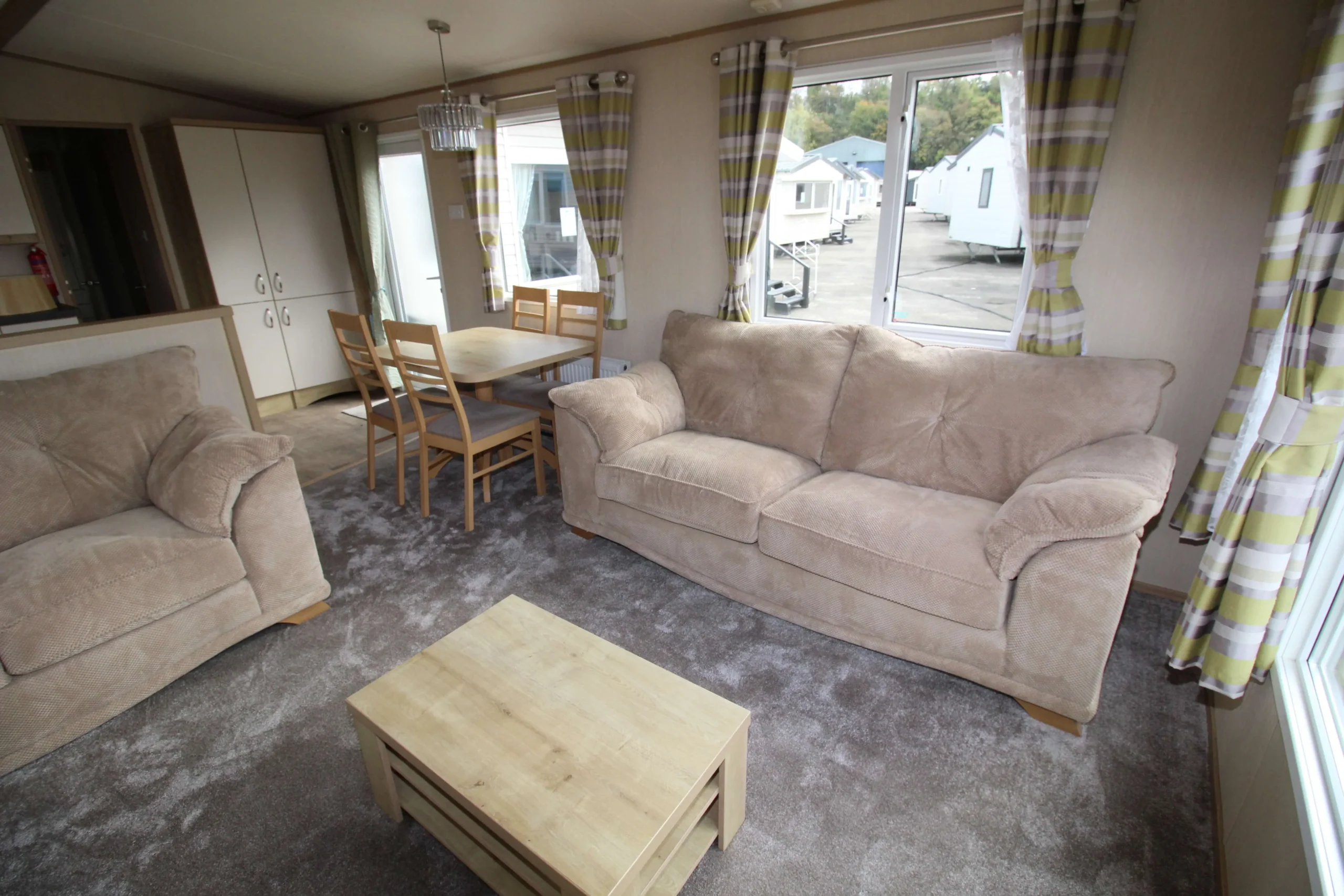 Discover this 2015 ABI Alderley mobile home. At 36x12ft, it may be slightly smaller, but it feels surprisingly spacious. The lounge is bright and open. Large windows fill the room with natural light. Two big, free-standing sofas create a cosy space for relaxing. The lounge flows naturally into the dining area.