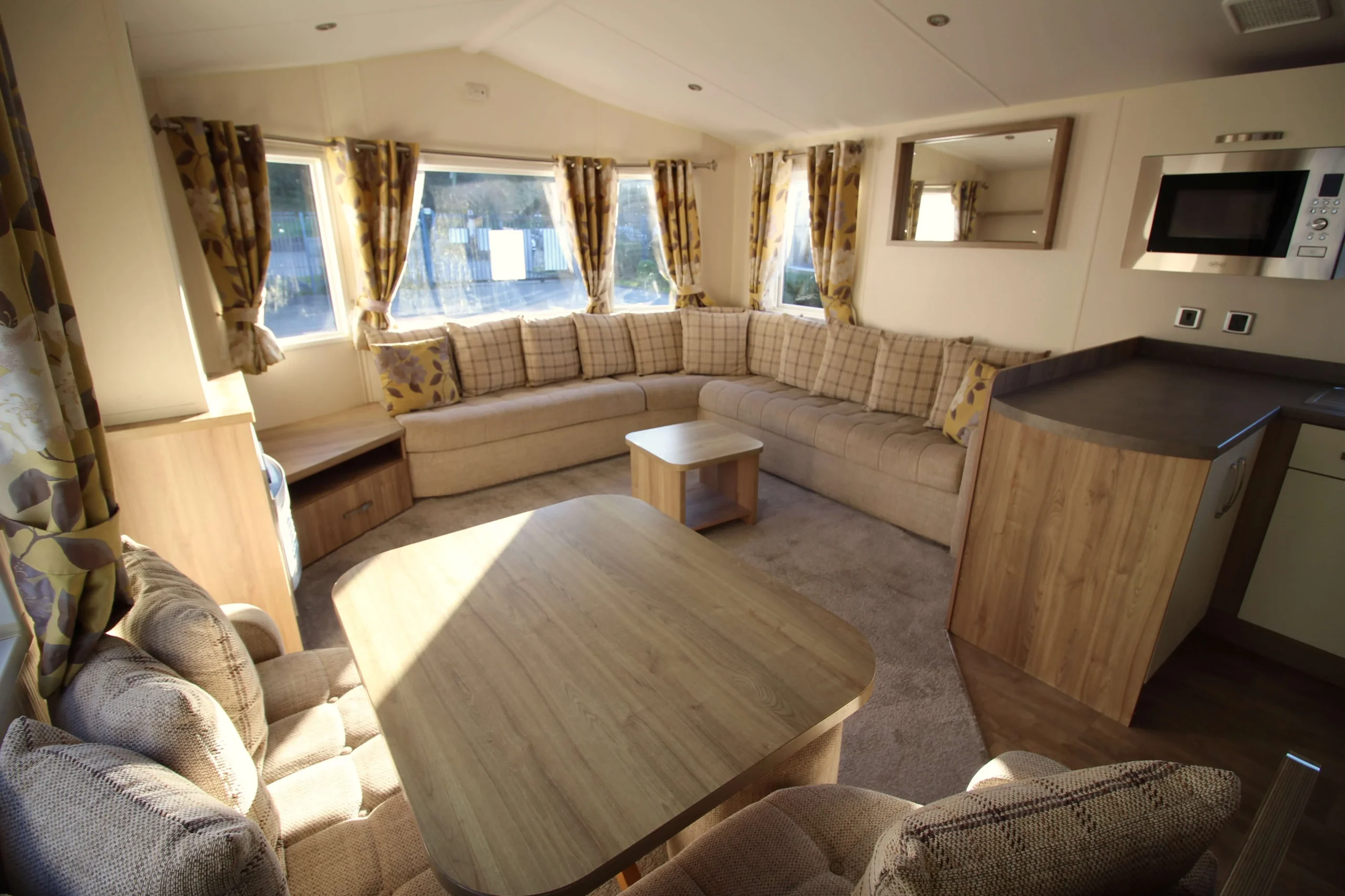You step into a spacious front lounge with a large L-shaped couch that wraps around the side and front of the mobile. It offers loads of room for relaxing, chatting, or stretching out after a long day. The lounge also includes a pull-out sofa bed, giving you extra sleeping space when friends or family stay over.