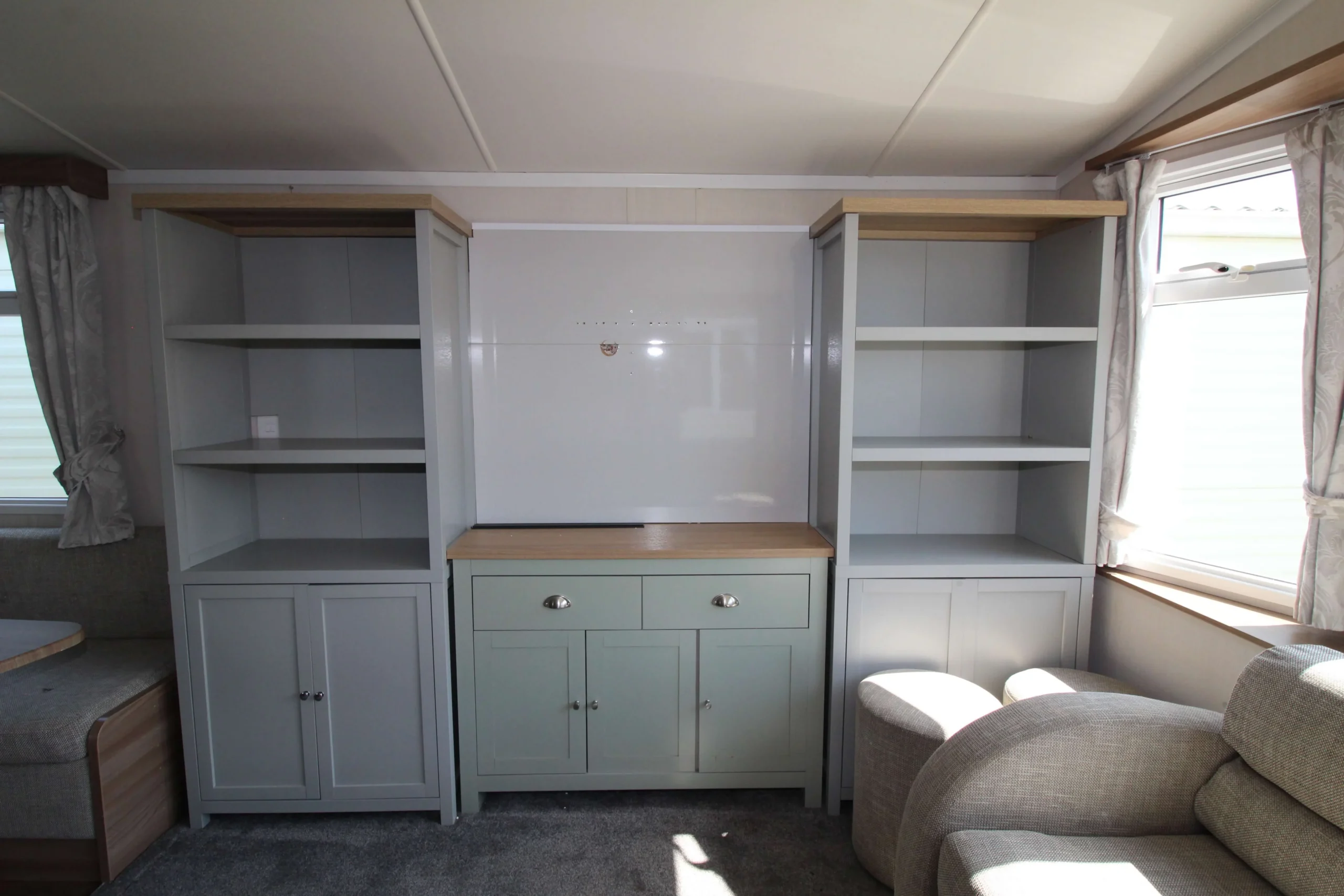 The living room also features gorgeous built-in storage units on either side of the TV area. These units add both style and practicality, helping to keep the space organised and clutter free.