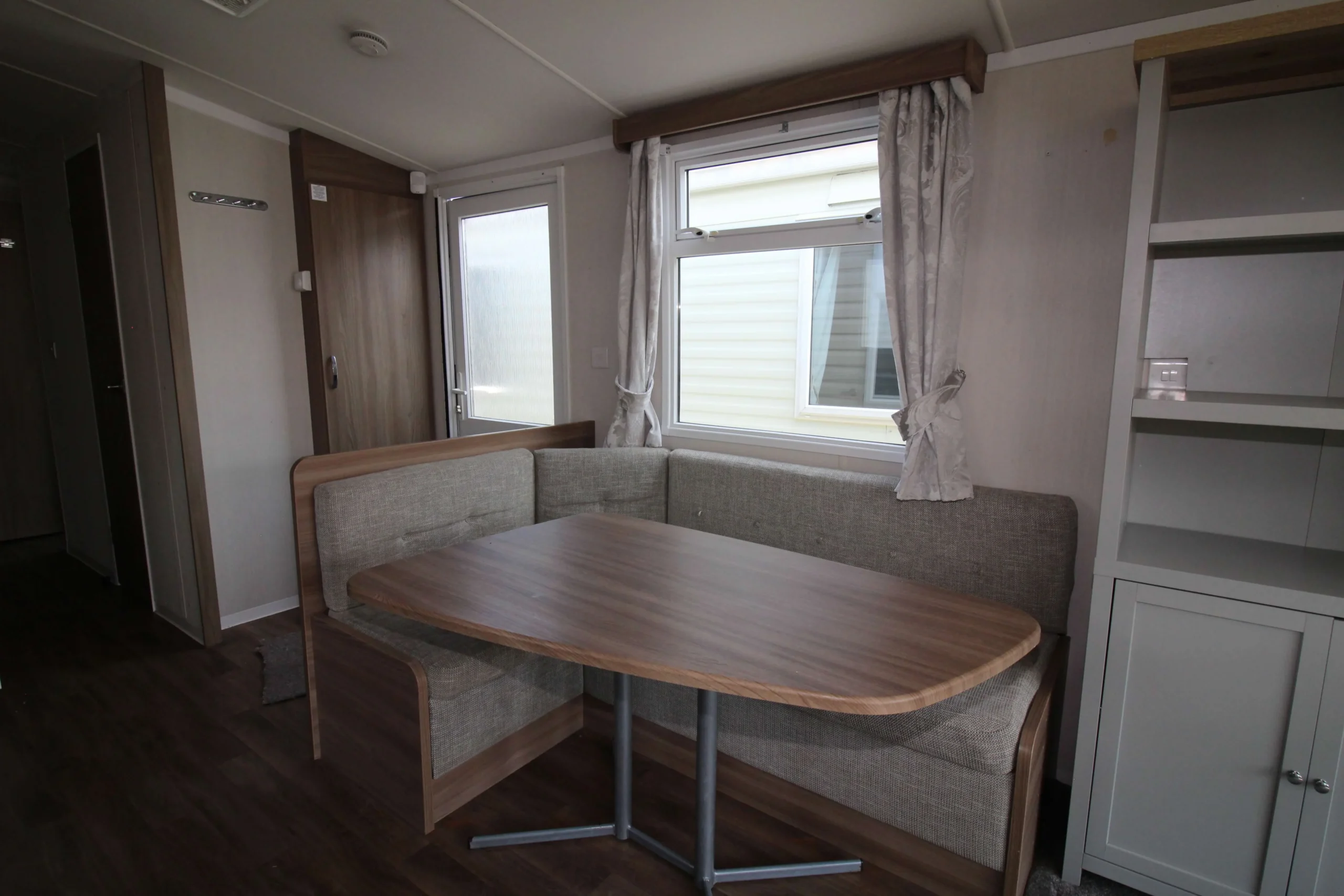 The fixed dining area includes built-in seating and two pouffe stools. This clever layout maximises space while still giving everyone room at the table. Therefore, it works perfectly for family meals, games nights, or hosting guests.