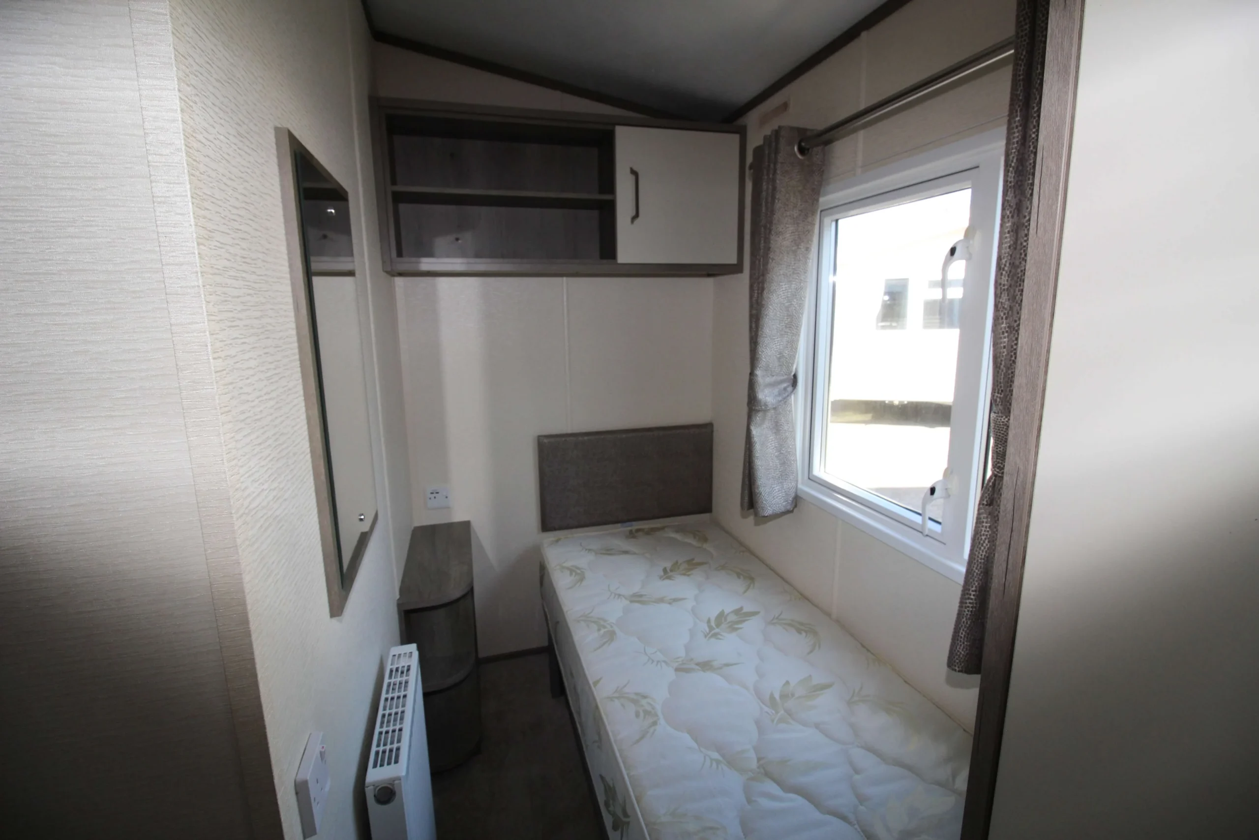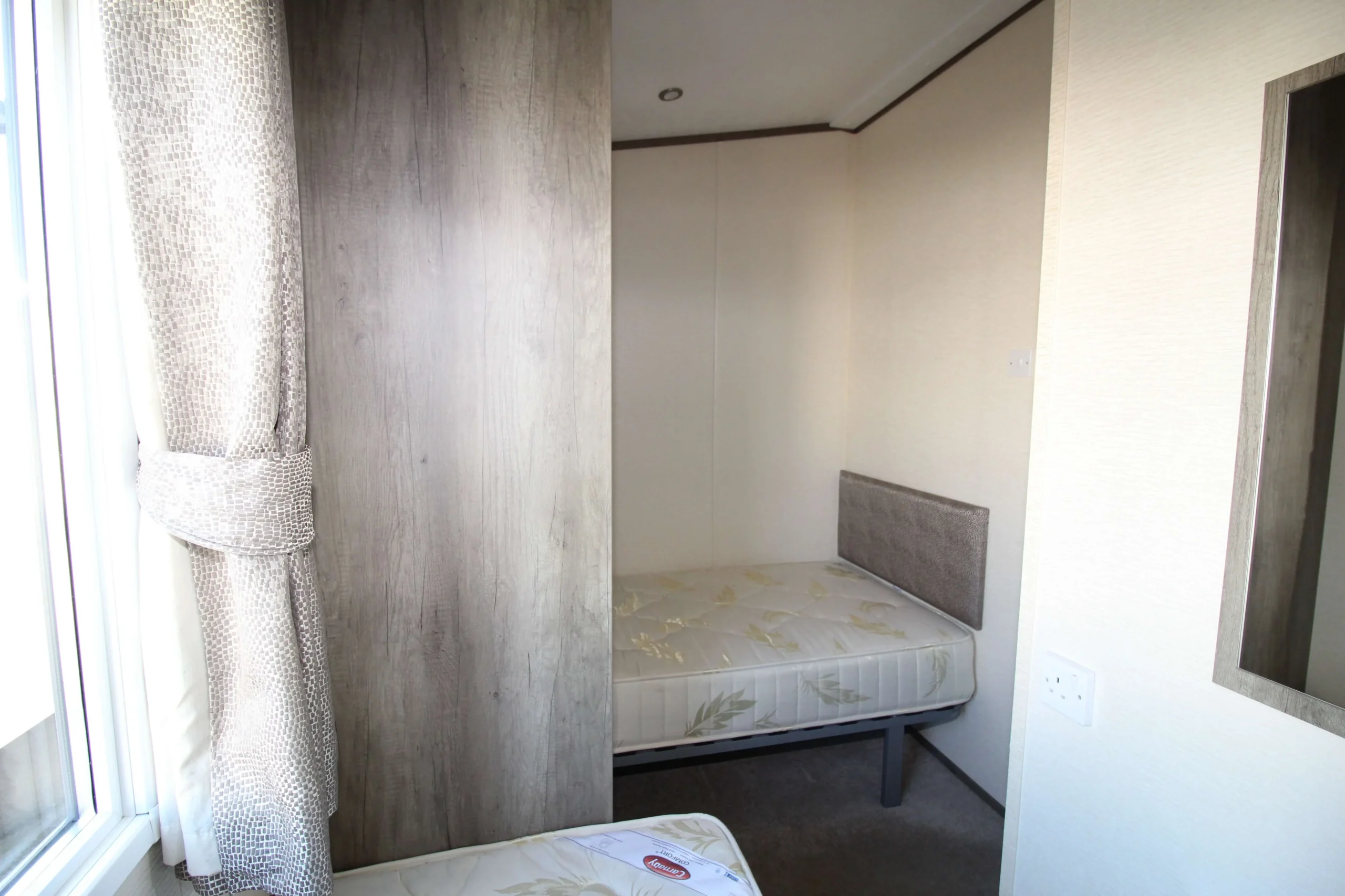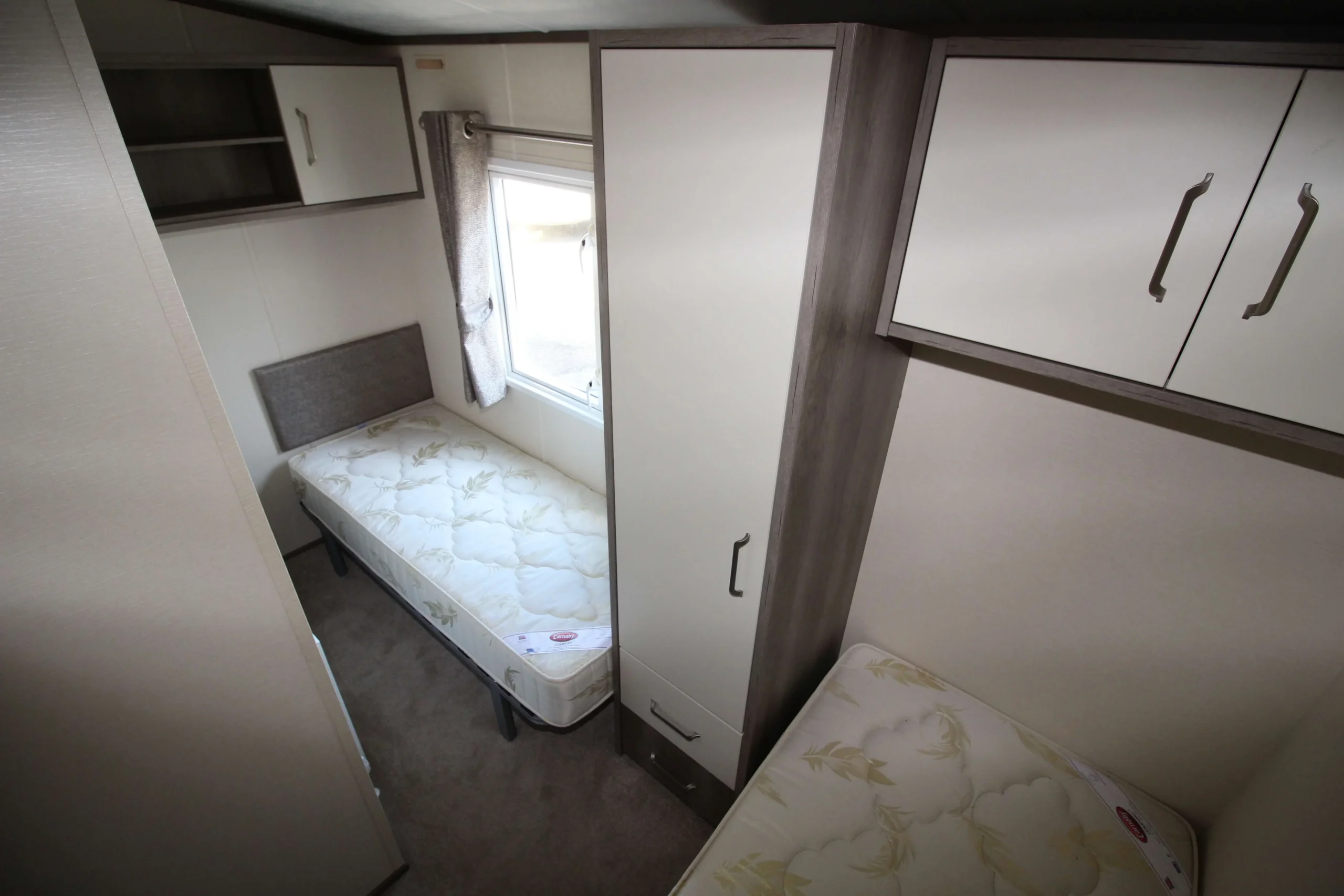 The twin bedroom features a clever separated bed layout. This design gives each sleeper their own personal space.