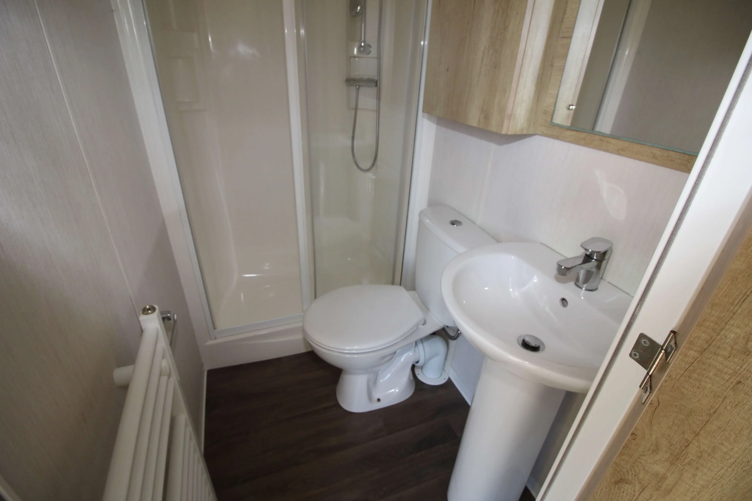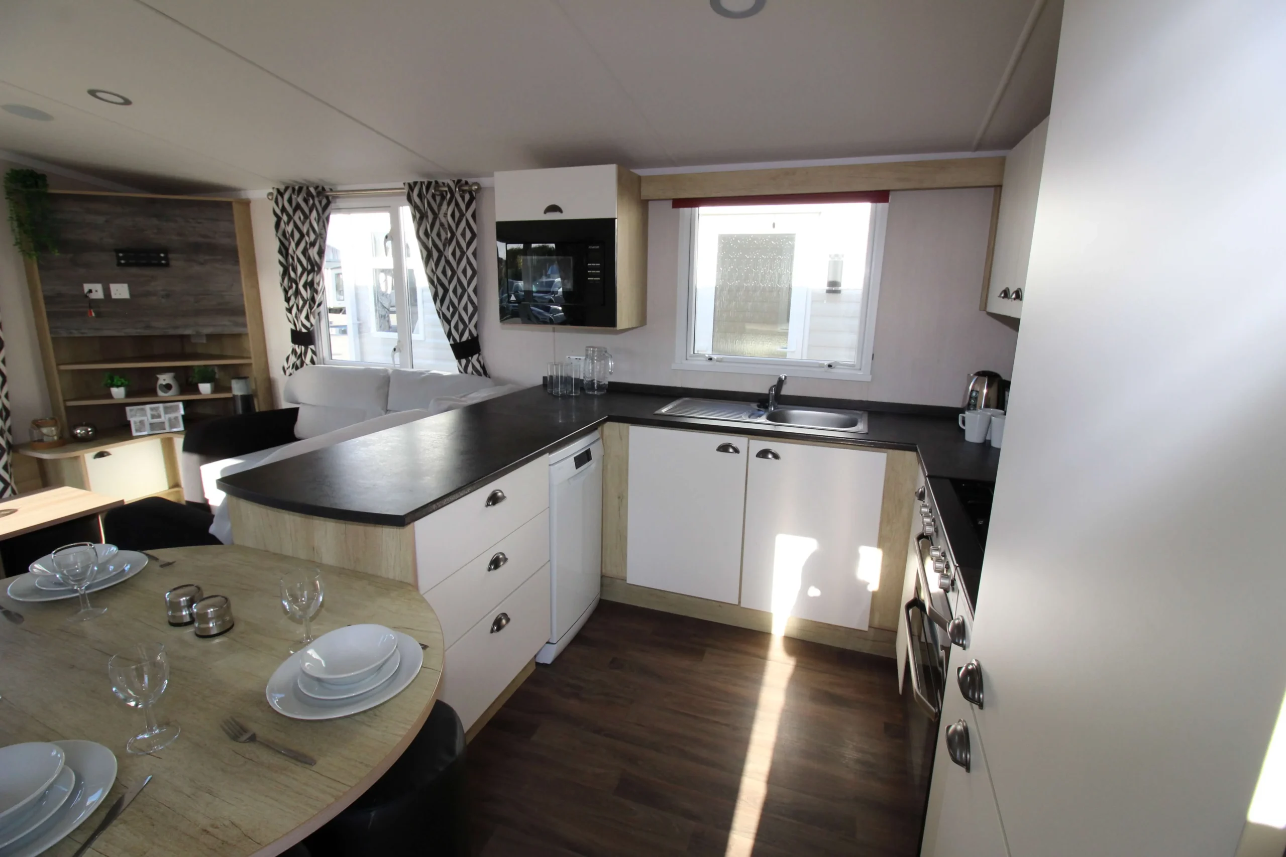 The kitchen is both stylish and practical. It includes an integrated fridge freezer, microwave, and a slimline dishwasher for easy clean-up. There’s plenty of counter space too, ideal for cooking up family favourites or quick snacks between adventures.