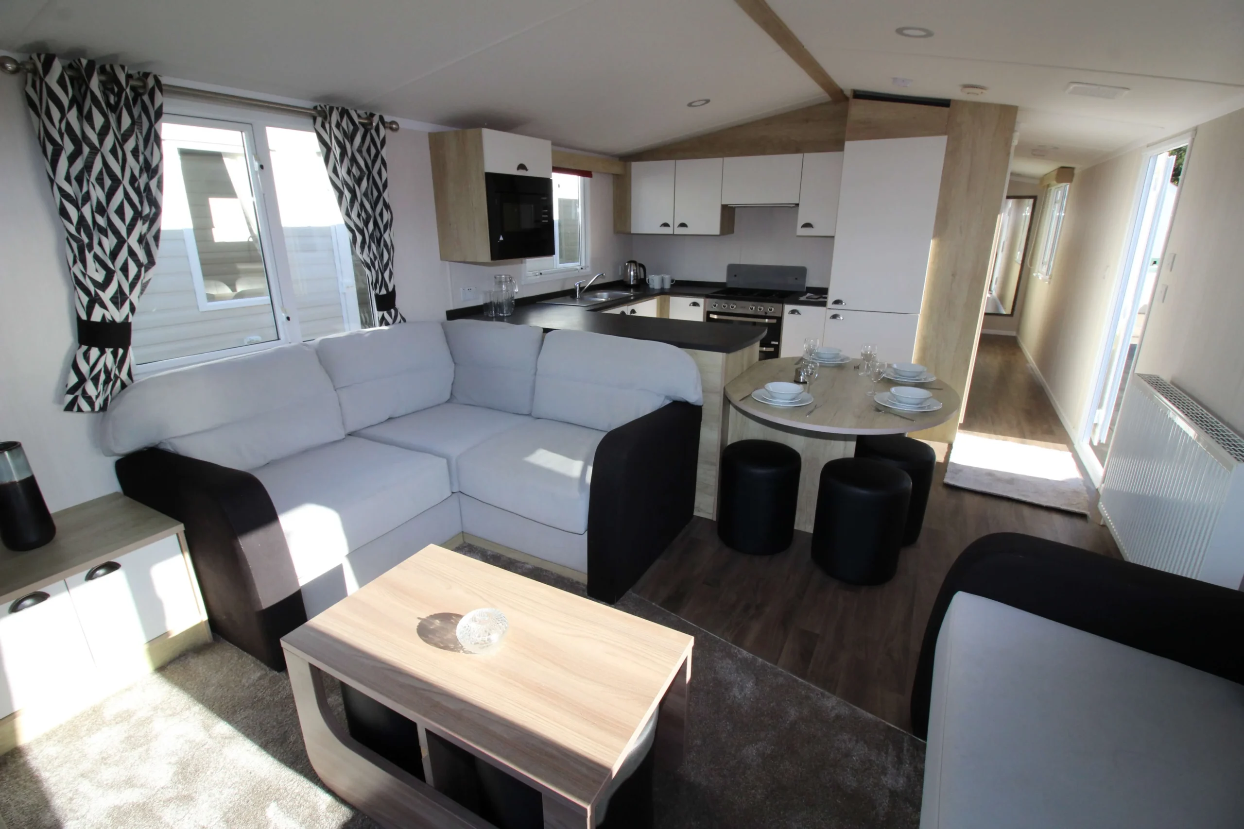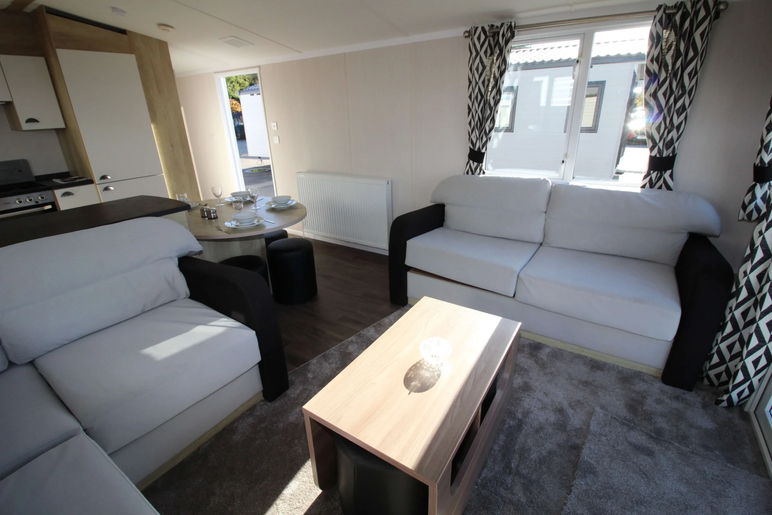 Step inside and you’ll instantly feel at home. The open-plan living area is warm and inviting, featuring French doors to the front that flood the space with natural light. Two sofas create a relaxing space to unwind together. The dining table includes five pouffe stools, making mealtimes fun and flexible for everyone.