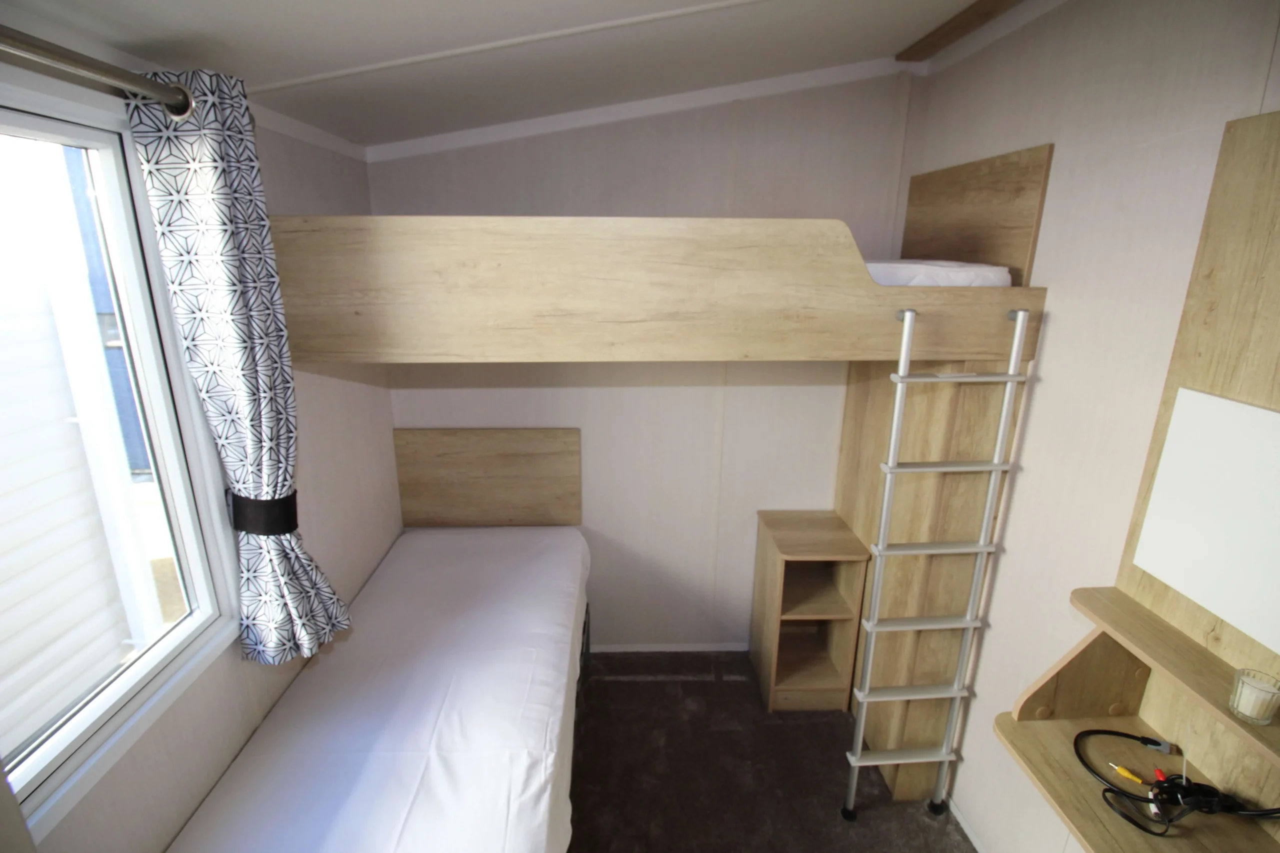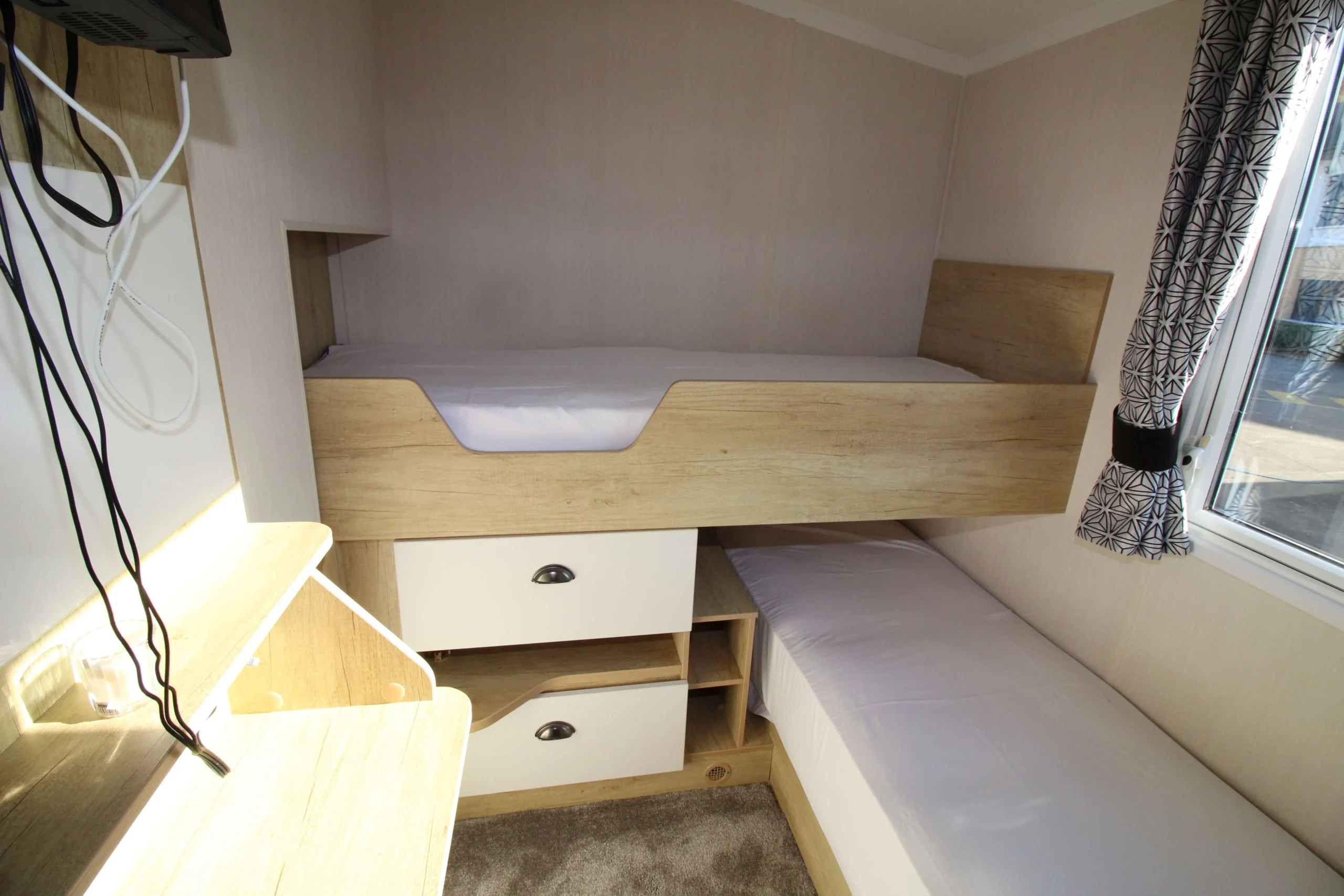 In the main bedroom, you’ll find comfort and calm with a double bed, ample wardrobe space, and a private en suite. The two twin bedrooms are perfect for kids, each featuring built-in bunk beds that create a fun and cosy sleeping area.