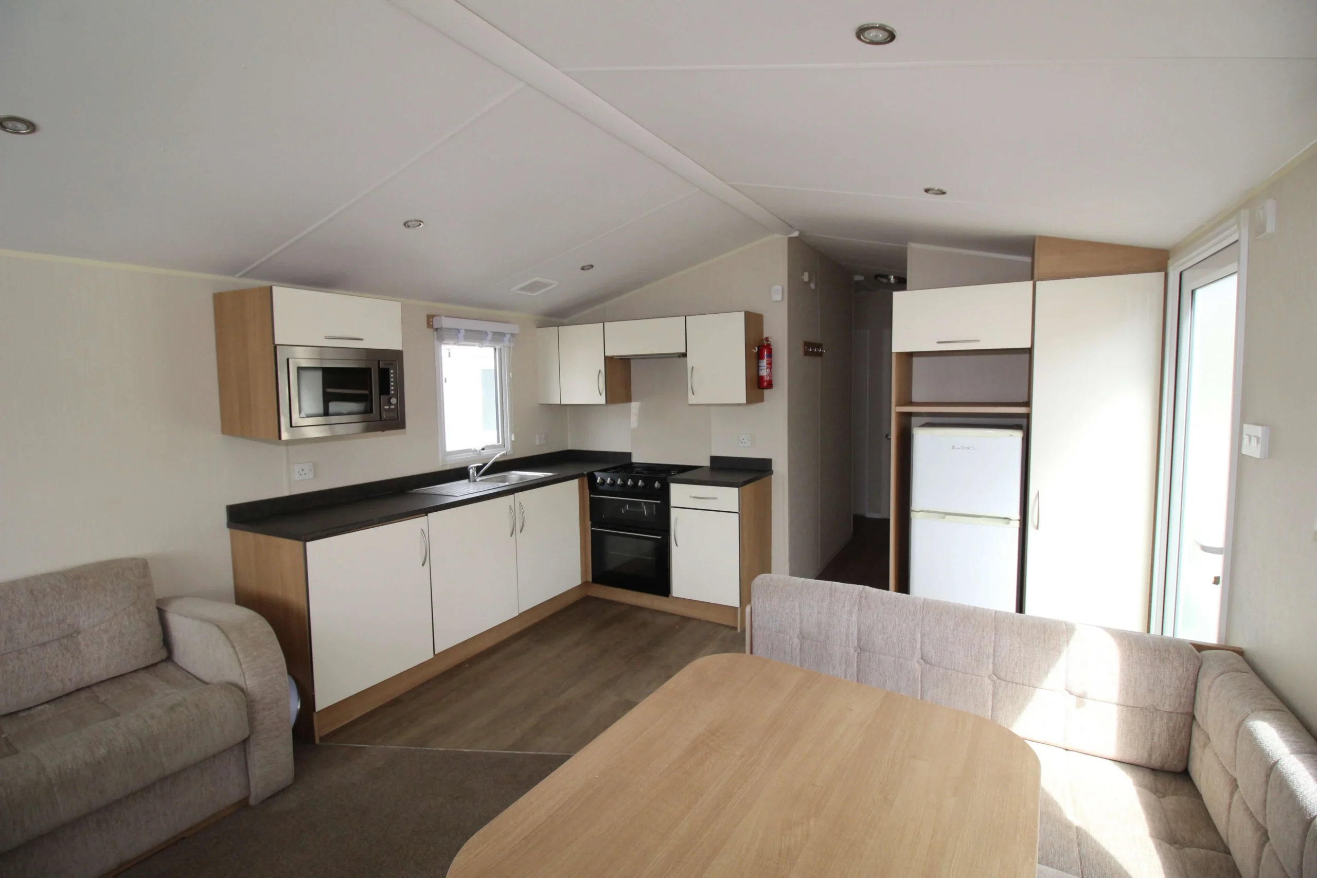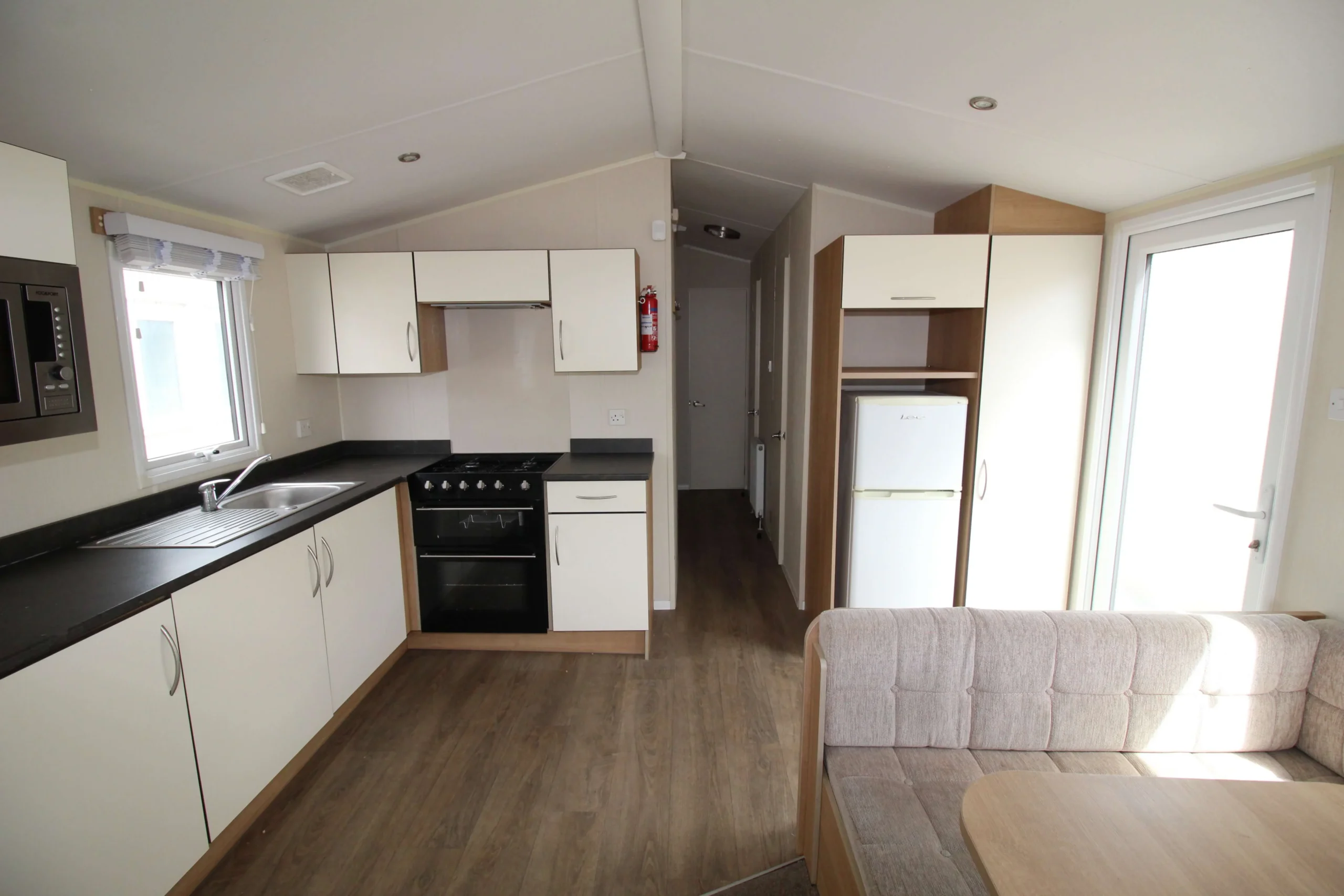Step into the spacious open-plan living area and you will immediately notice how well the space works. A large L-shaped couch creates a comfortable place to relax, while the layout keeps the room feeling open and uncluttered. In addition, a fold-out sofa bed provides extra sleeping space, making this mobile home ideal for hosting guests.