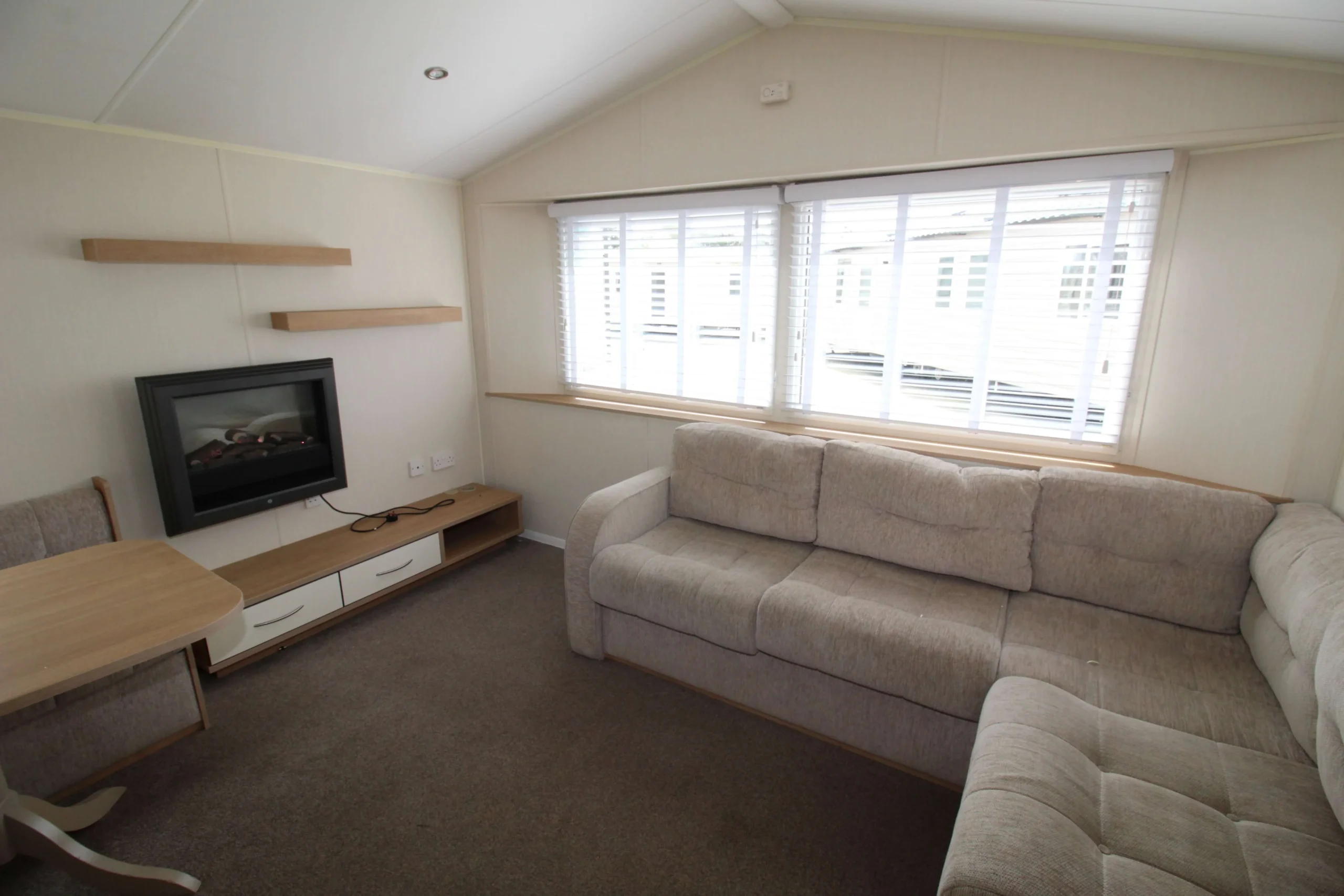 The dining area features a fixed L-shaped dinette with pouffe stools. This setup maximises seating without taking up unnecessary space. As a result, the living area feels bigger and more sociable, perfect for family meals or evenings together.