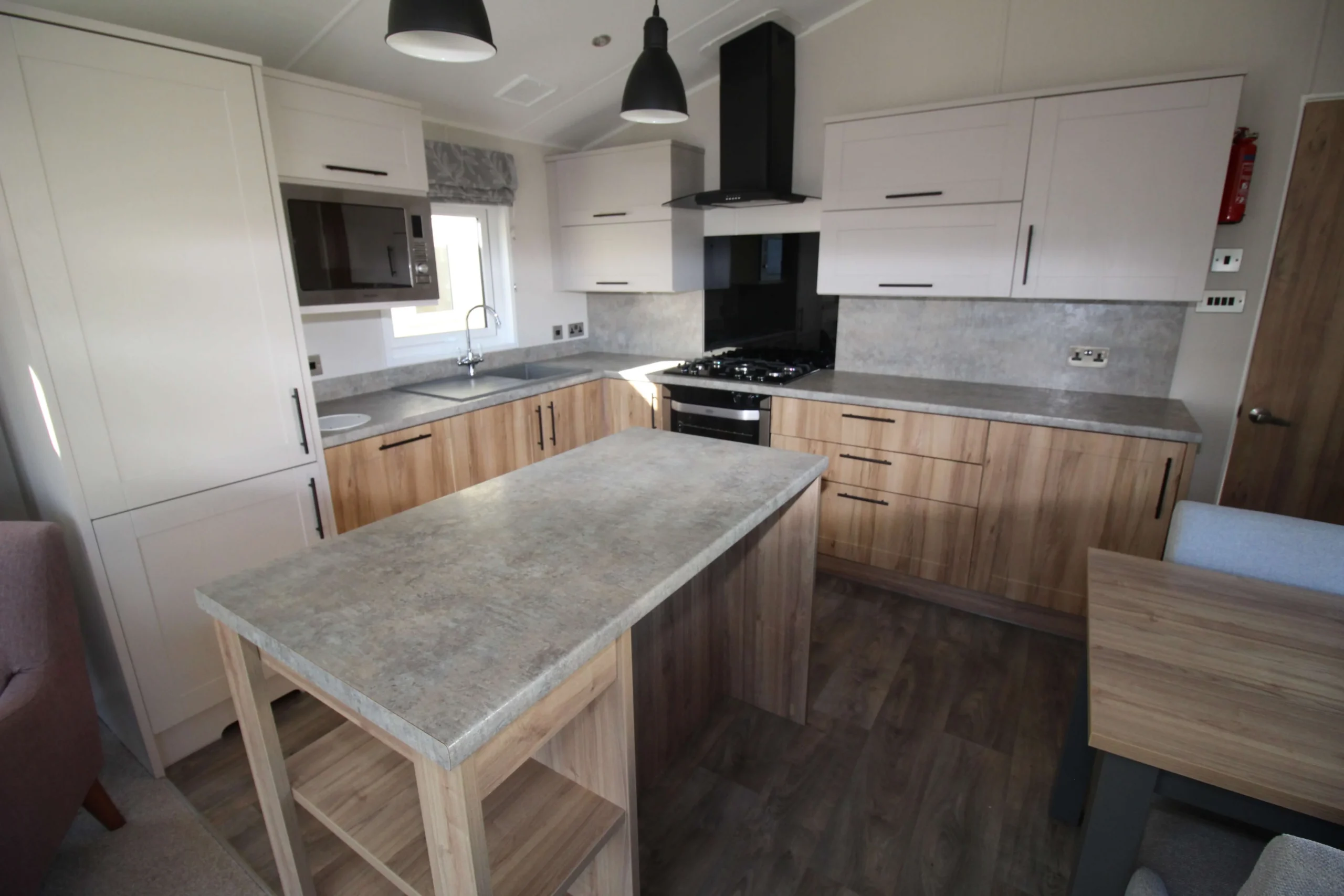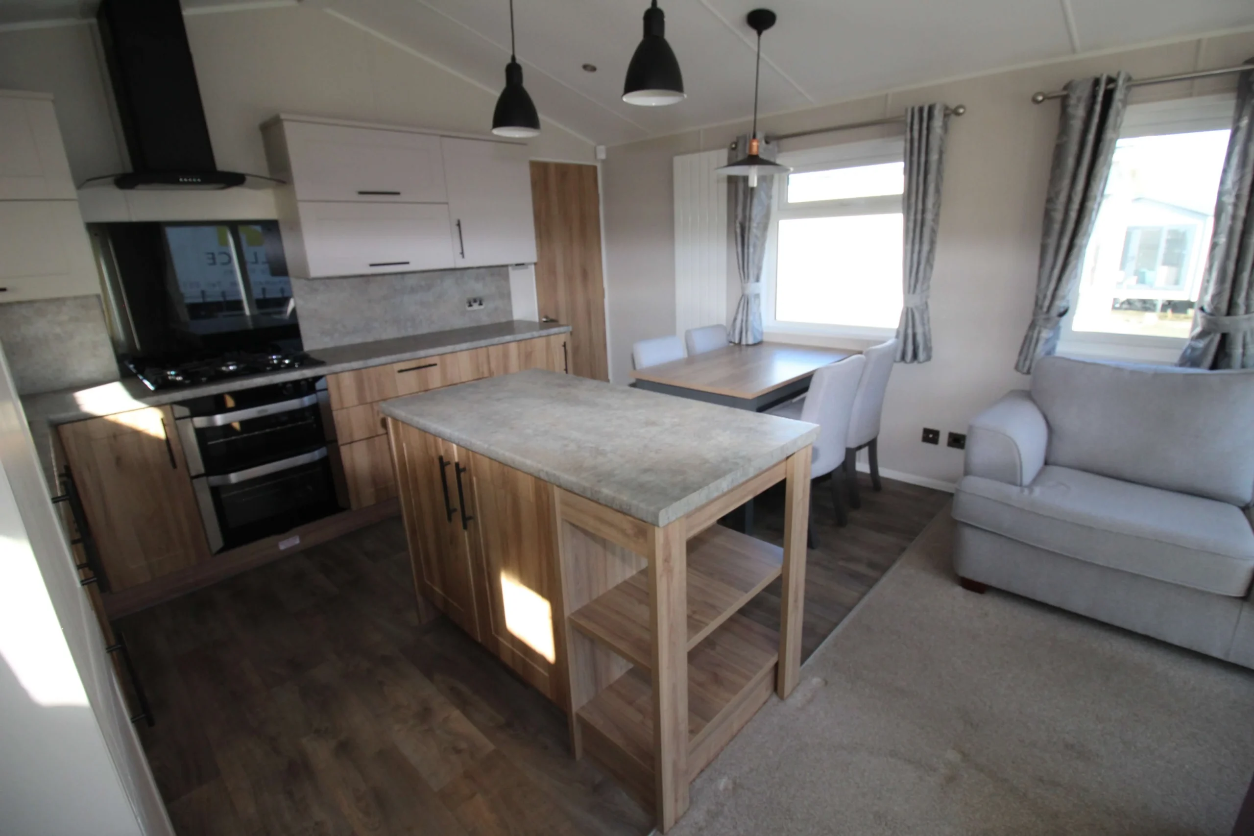 Moving into the kitchen, the Waverley continues to impress. A central kitchen island provides excellent workspace and extra seating options. Meanwhile, the freestanding dining table and chairs create a perfect spot for family meals or entertaining guests.