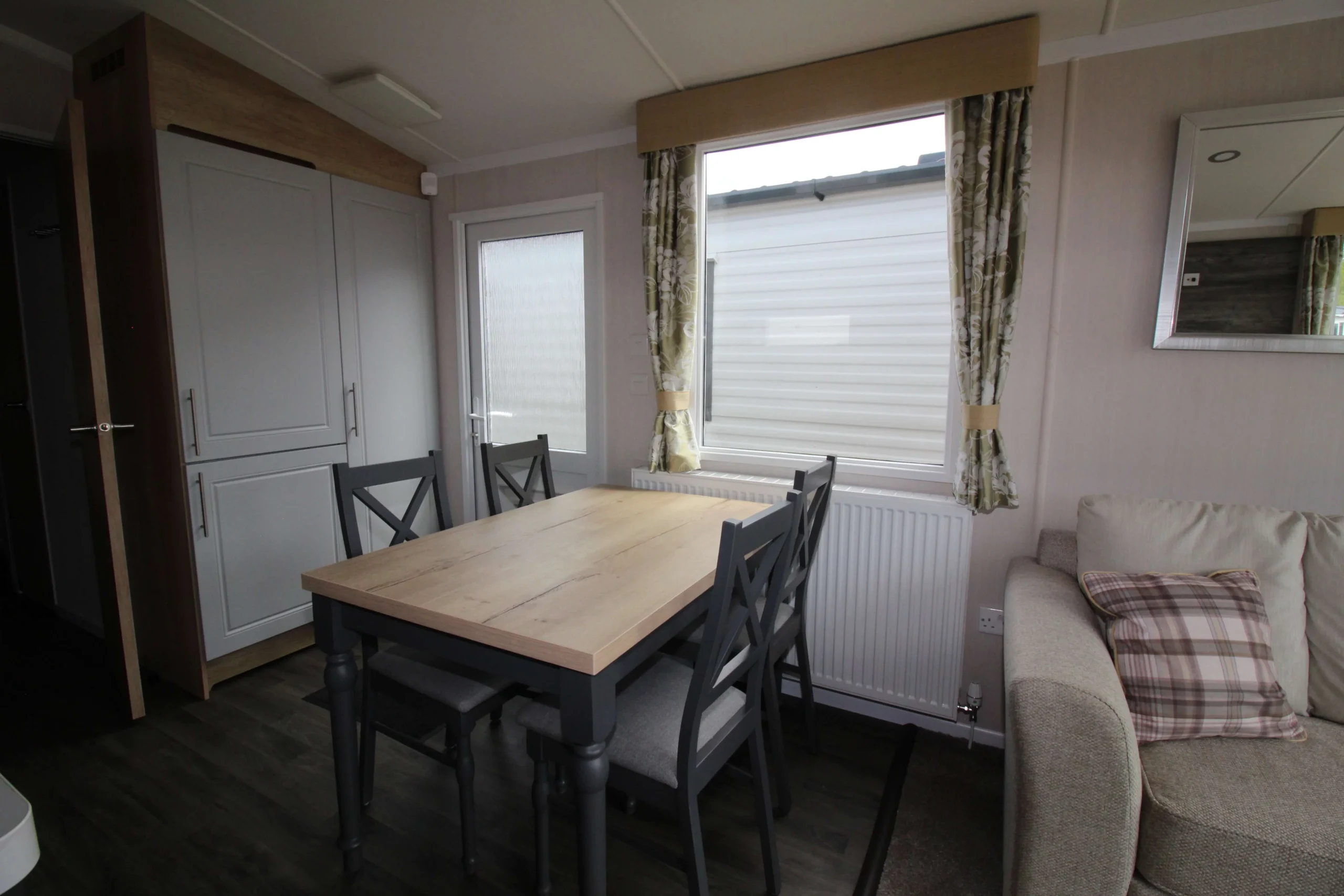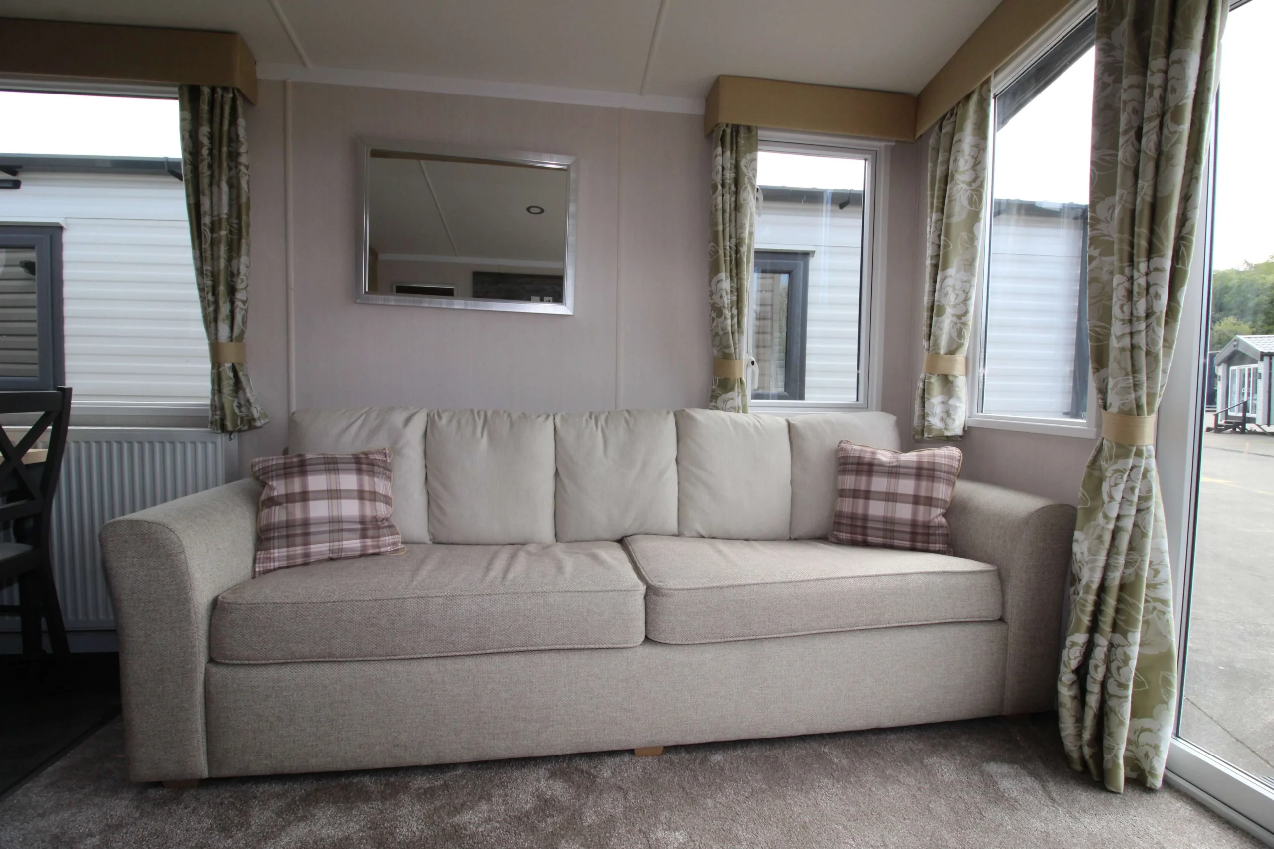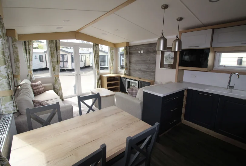 The sitting room features neutral freestanding sofas with large scatter cushions, creating a relaxed and comfortable setting. In addition, a pull-out sofa bed provides extra sleeping space for guests. Therefore, this mobile home works perfectly for both everyday living and entertaining.