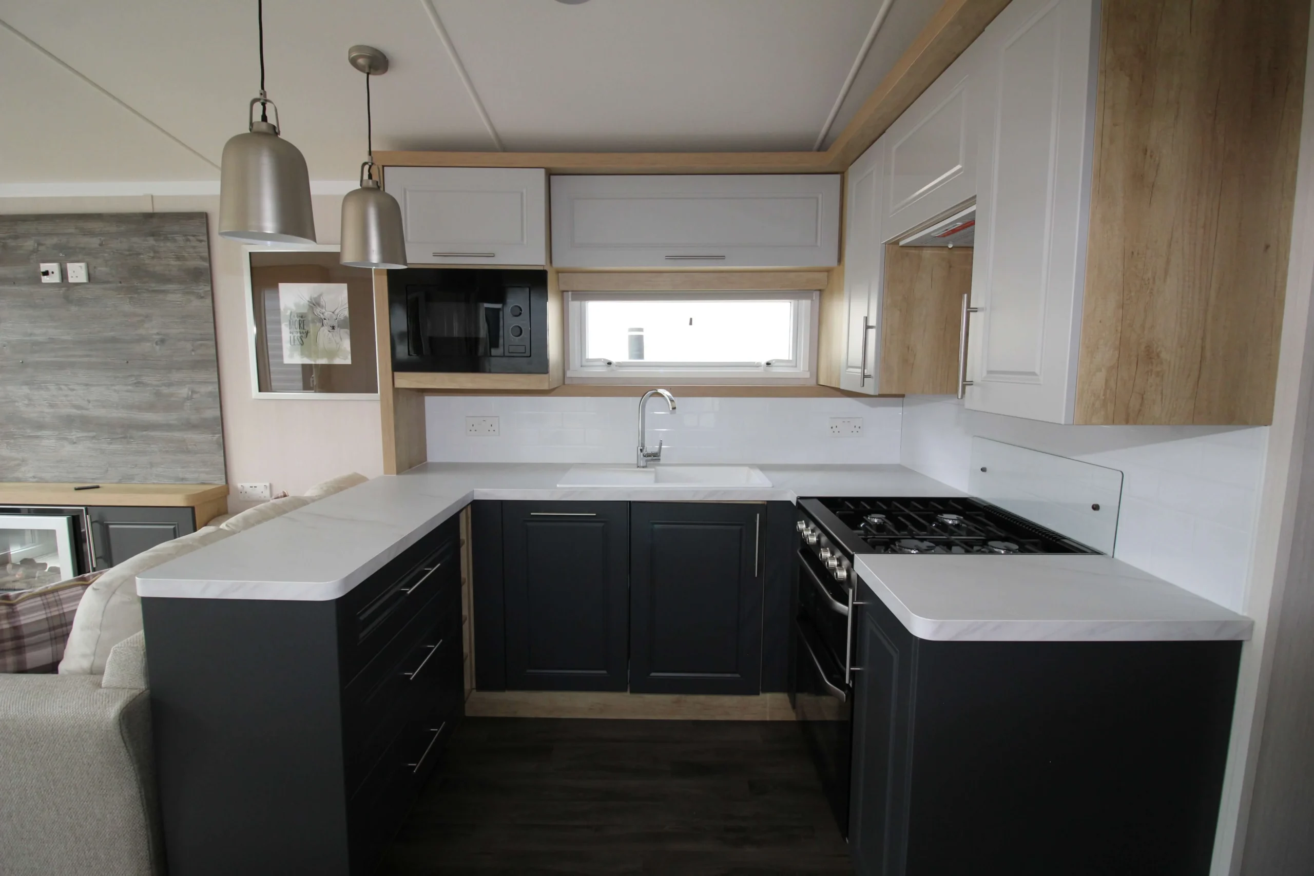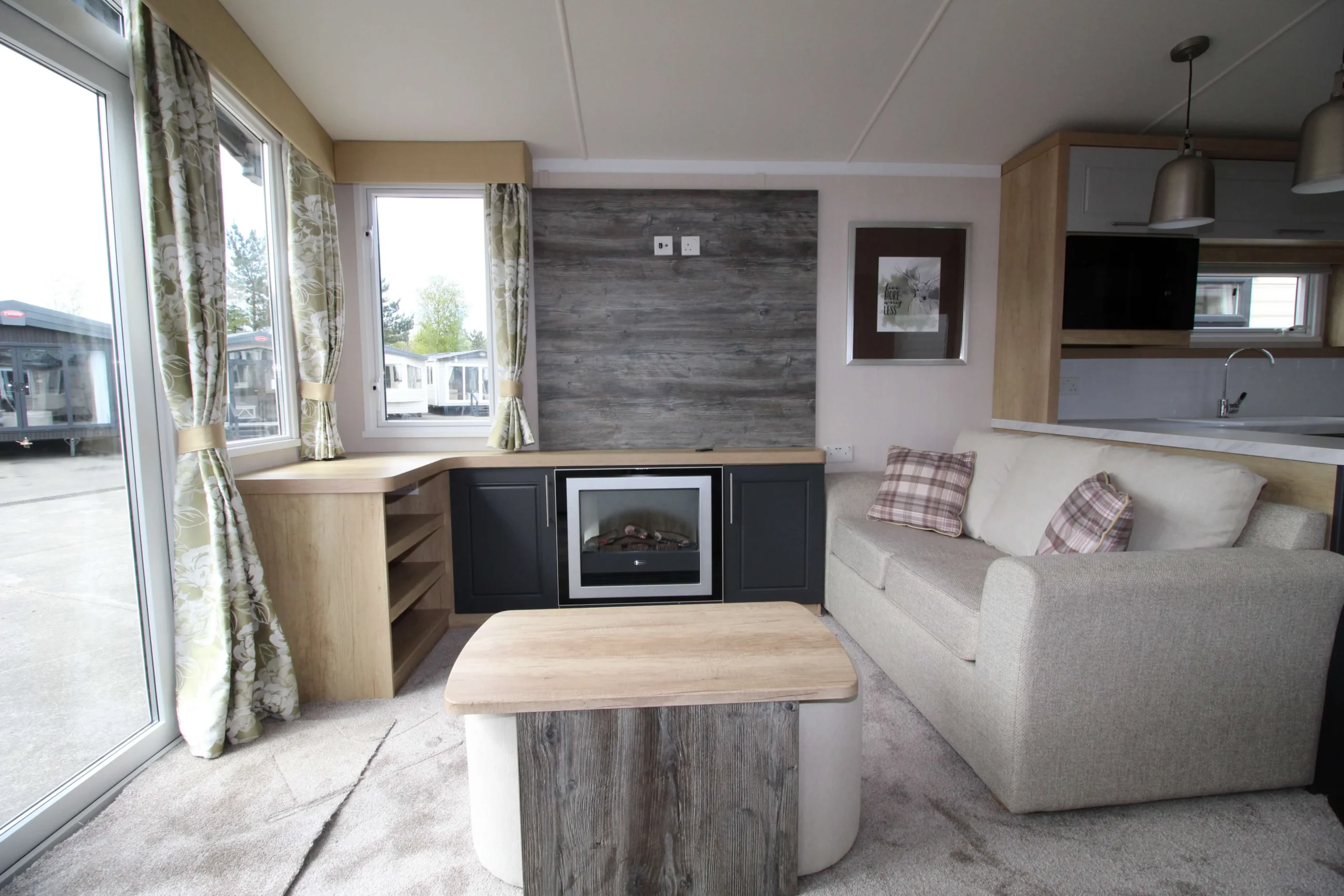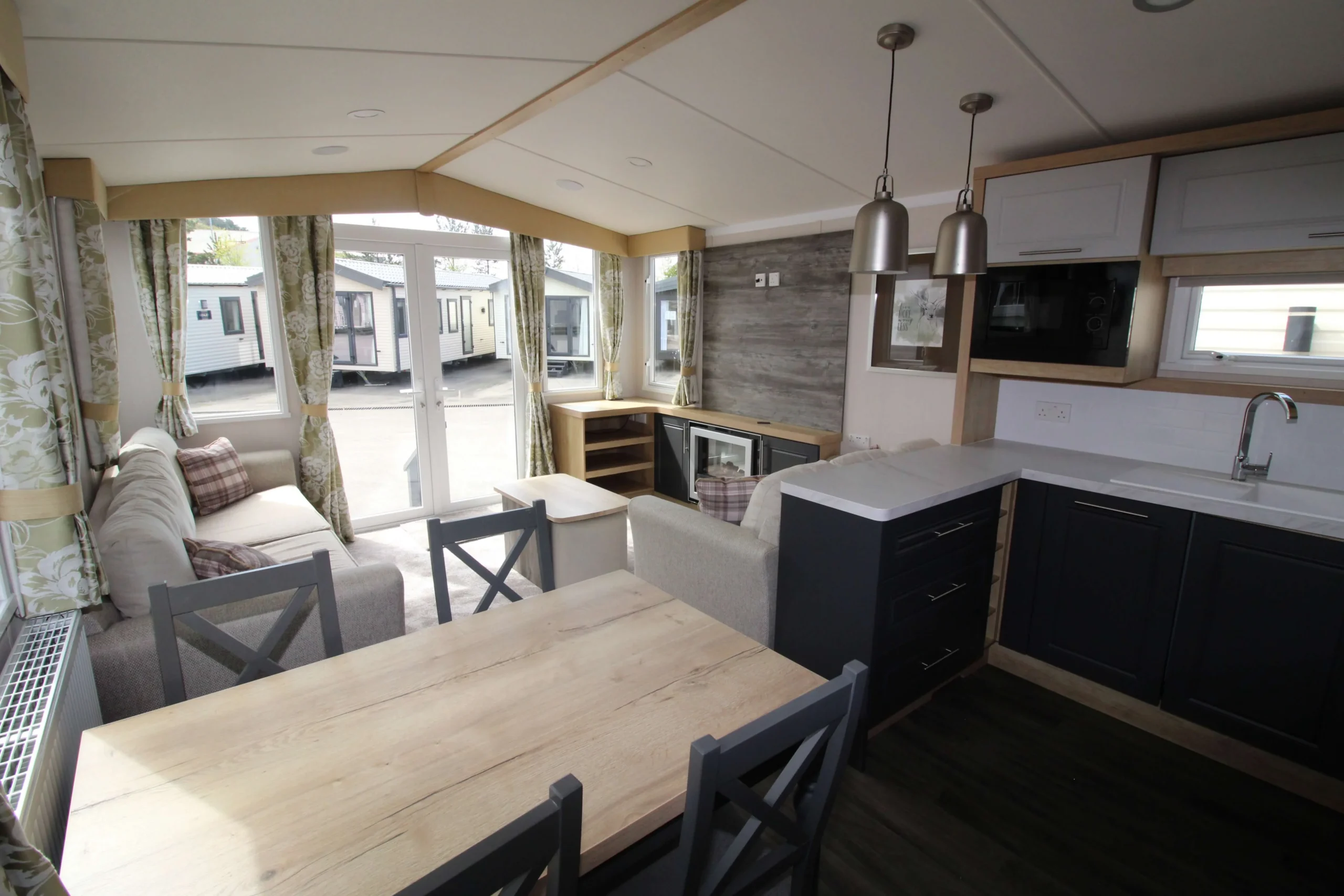 The sitting room features neutral freestanding sofas with large scatter cushions, creating a relaxed and comfortable setting. In addition, a pull-out sofa bed provides extra sleeping space for guests. Therefore, this mobile home works perfectly for both everyday living and entertaining.