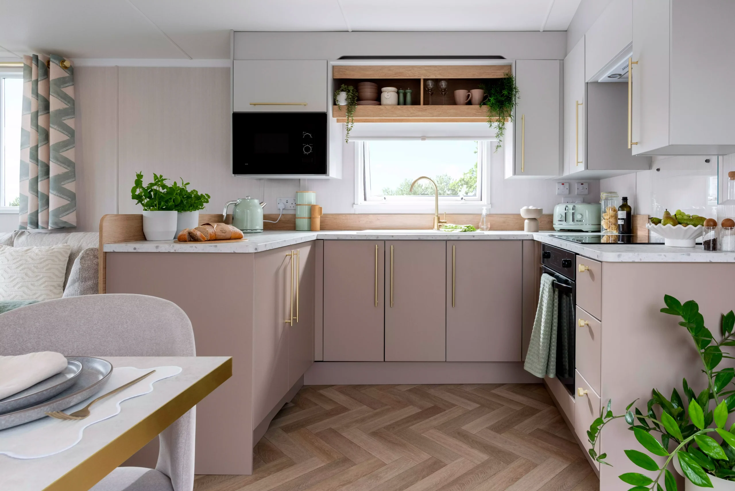 Inside, the colour scheme is beautifully balanced. Fresh mint greens, Terrazzo-style finishes, and subtle hints of gold create a calm and uplifting space. The open-plan living area feels bright and spacious, perfect for relaxing after a day out or hosting family gatherings. Large windows flood the room with natural light, while the freestanding furniture gives you flexibility to arrange your space exactly how you like it.